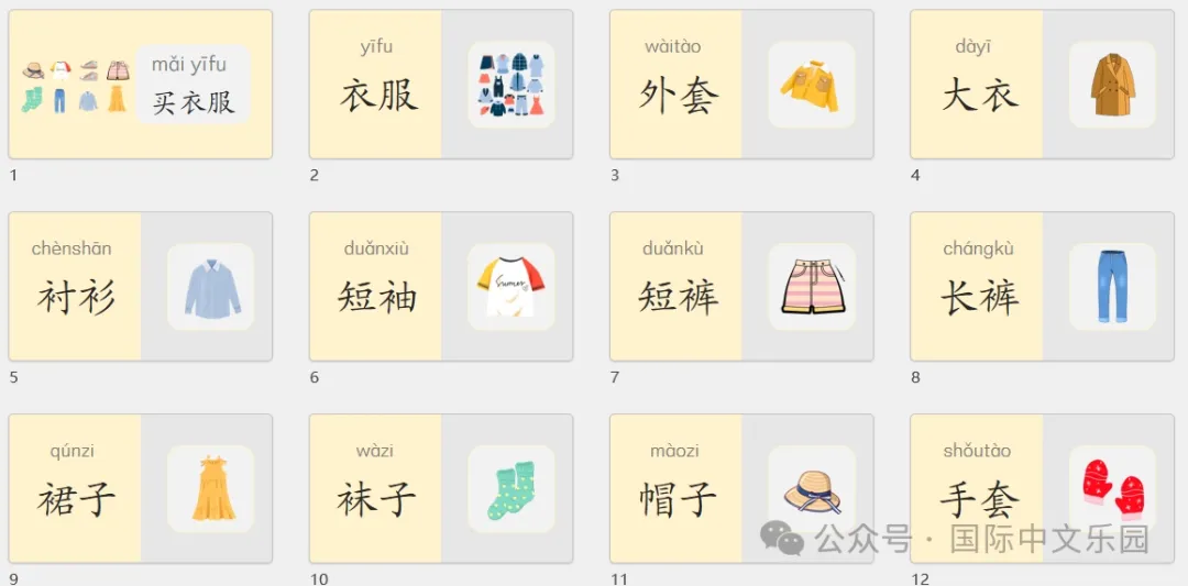 各位老师大家好呀,今天小编给大家分享一个主题课件,是关于买衣服主题的。小编在这个课件中展示了很多和“衣服”相关的词汇,供大家教学或学习使用。