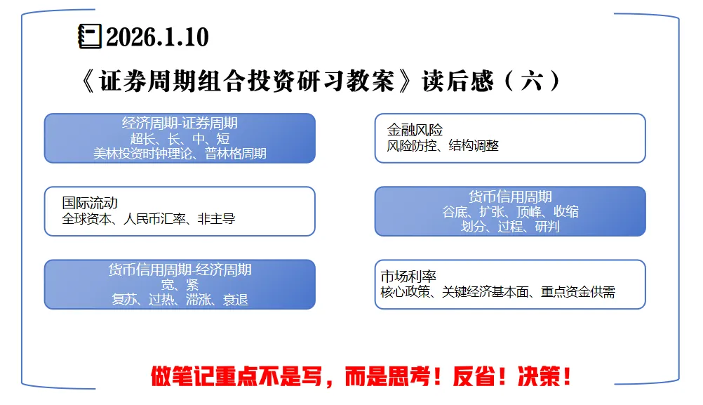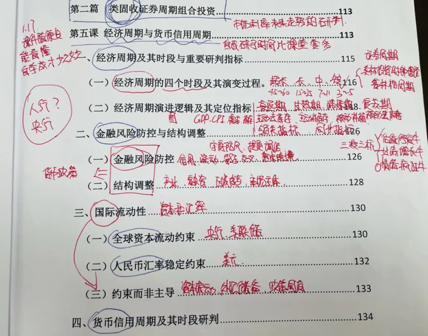 这一课从经济周期的四个时段——复苏、过热、滞涨、衰退开始讲,然后是怎么用GDP和CPI这些指标去定位当前处在哪个阶段,教材上的配图非常的清晰。接着是金融风险防控,资产风险、债务风险、流动性风险这三类,再往下是结构调整,去杠杆、减杠杆、稳杠杆。然后国际流动性,有关资本汇率、外汇储备、人民币汇率稳定约束,一路推到“约束而非主导”这个结论。最后落到货币信用周期,信贷扩张、紧缩、收缩的时段划分,M1、M2这些指标的运用。