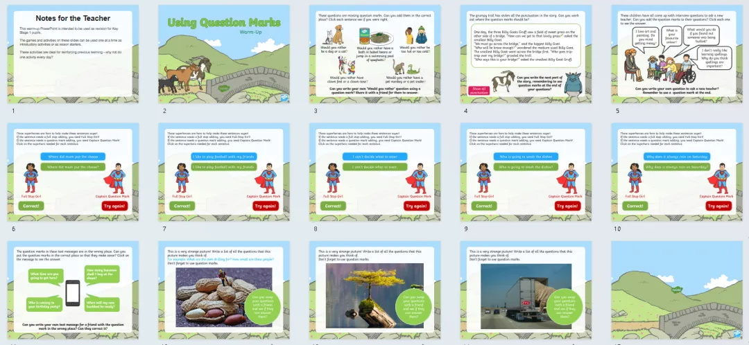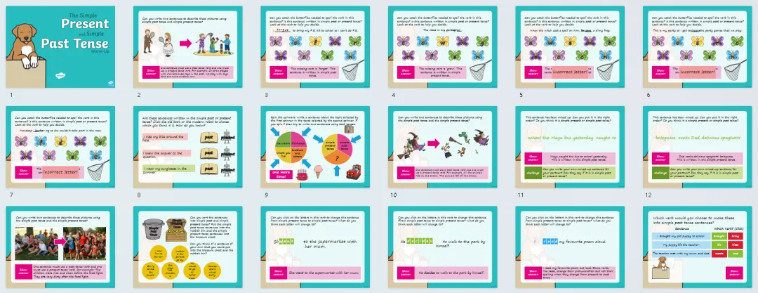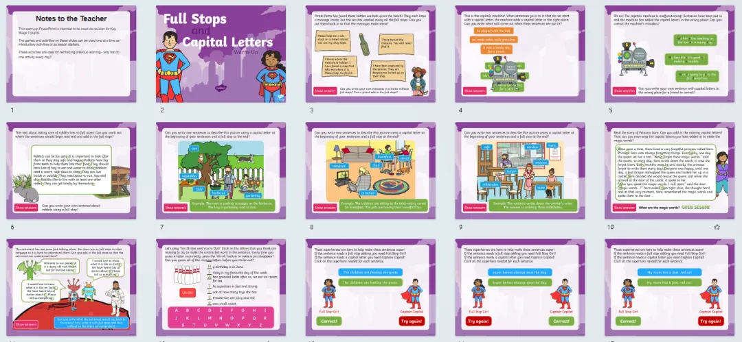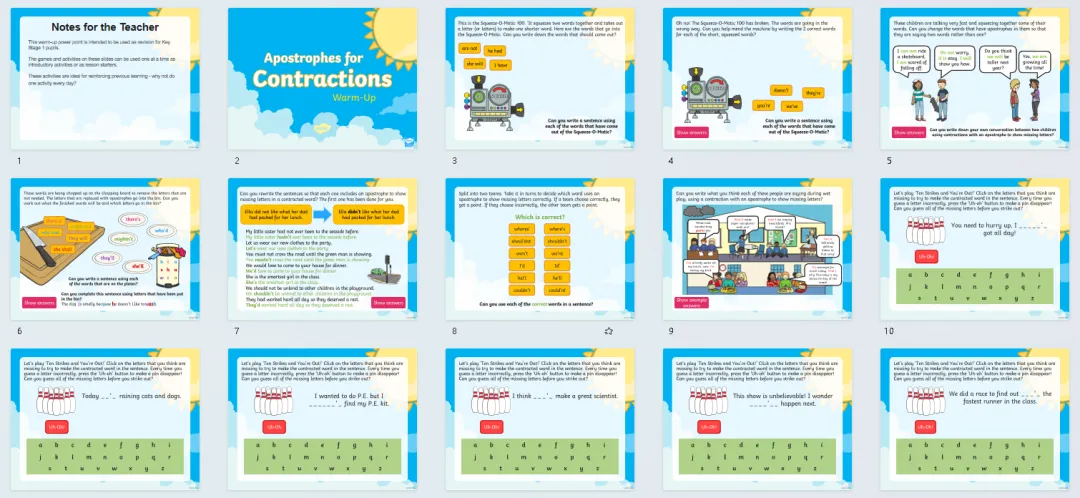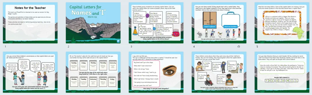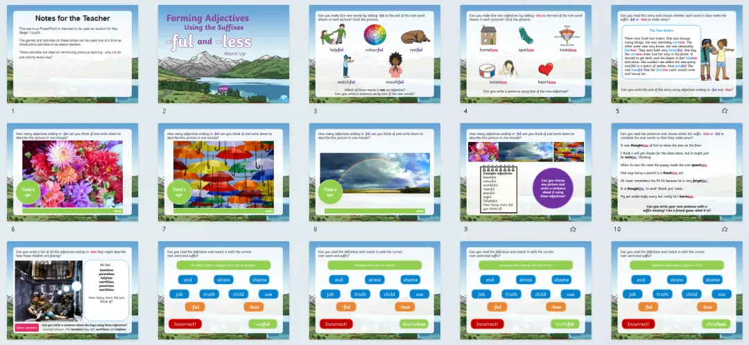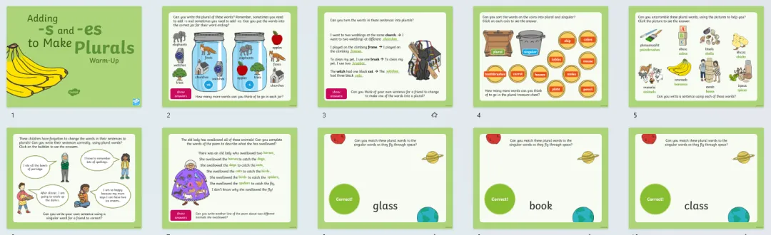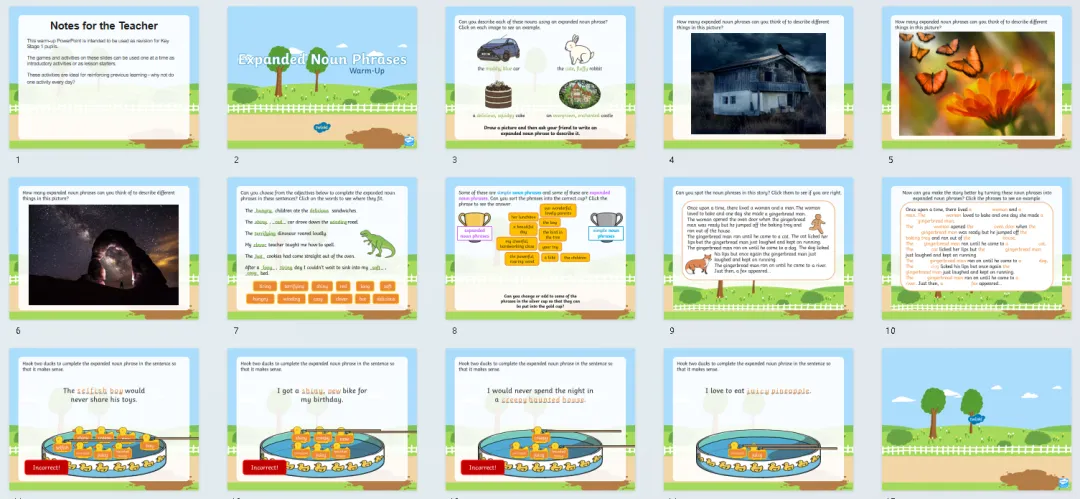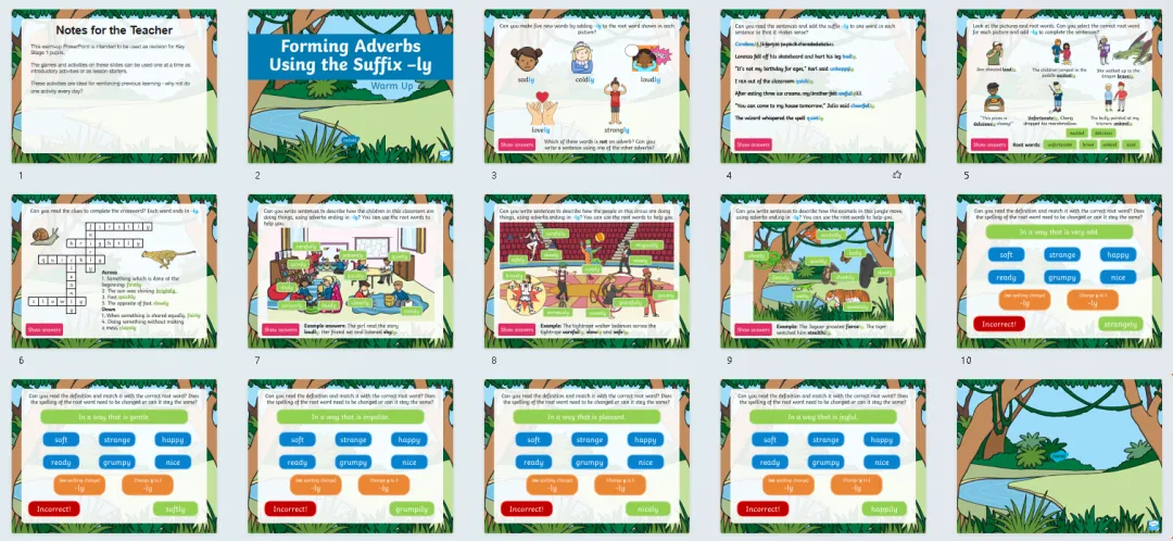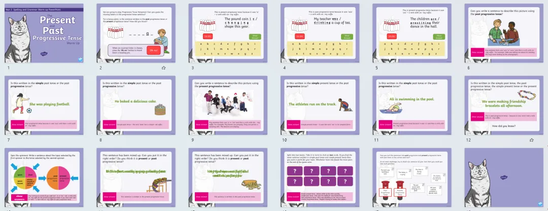今天分享24套高好玩的语法热身游戏PPT课件,包含名词、缩略词、词根词缀、副词、连接词、现在时、过去时、进行时、比较级最高级等。课前充分利用好五分钟,提升孩子们学习兴趣,巩固复习所学知识,边玩边复习。
