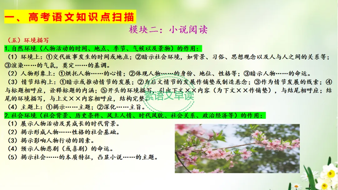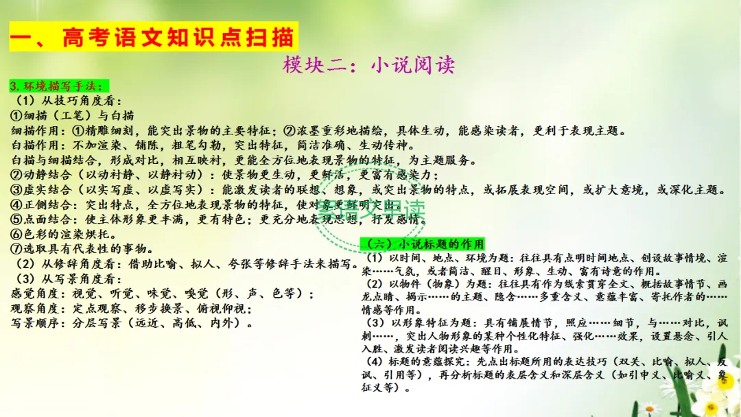 (3)情节结构上:①暗示或推动情节的发展;②为后文情节的发展作铺垫或制造悬念;③作为情节发展的线索;④与标题相呼应,诠释标题的内涵;⑤开头的环境描写,引出下文××内容(为下文××作铺垫),与结尾相呼应;结尾的环境描写,与上文××内容相呼应,结构完整。