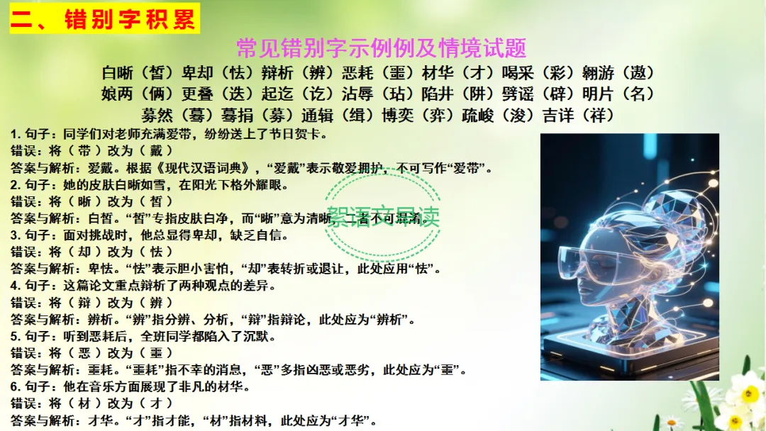 白晰(皙)卑却(怯)辩析(辨)恶耗(噩)材华(才)喝采(彩)翱游(遨)