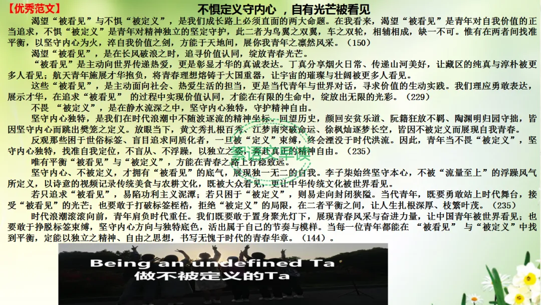 若只追求“被看见”,易陷功利主义泥潭;若只困于“被定义”,则易走向封闭狭隘。当代青年,既要勇敢站上时代舞台,接受“被看见”的光芒;也要敢于打破标签桎梏,拒绝“被定义”的局限,在二者平衡之间,让人生扎根深厚、枝繁叶茂。(235)