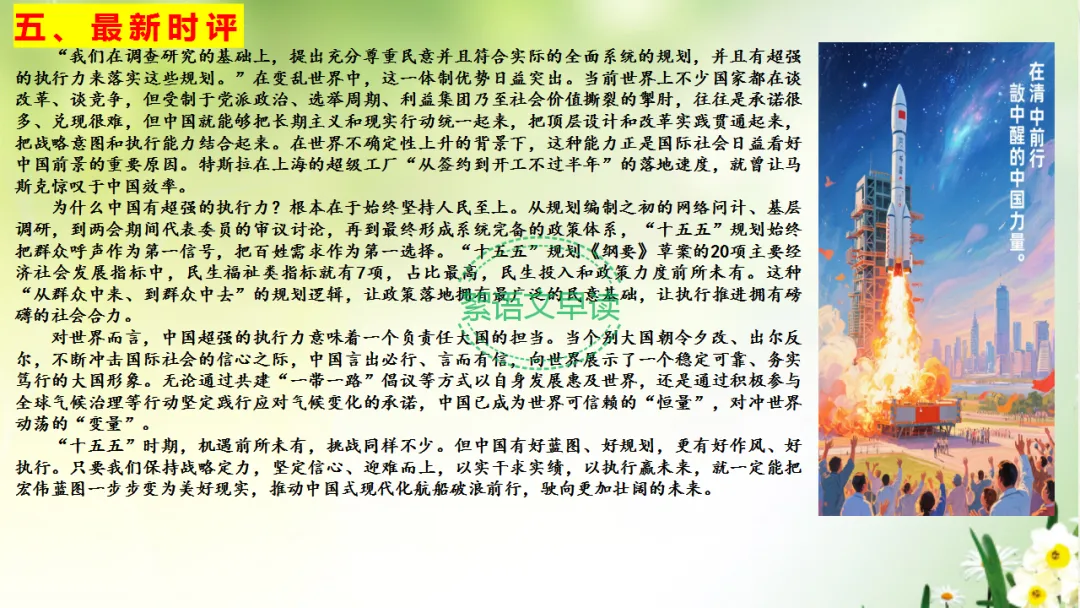为什么中国有超强的执行力?根本在于始终坚持人民至上。从规划编制之初的网络问计、基层调研,到两会期间代表委员的审议讨论,再到最终形成系统完备的政策体系,“十五五”规划始终把群众呼声作为第一信号,把百姓需求作为第一选择。“十五五”规划《纲要》草案的20项主要经济社会发展指标中,民生福祉类指标就有7项,占比最高,民生投入和政策力度前所未有。这种 “从群众中来、到群众中去”的规划逻辑,让政策落地拥有最广泛的民意基础,让执行推进拥有磅礴的社会合力。