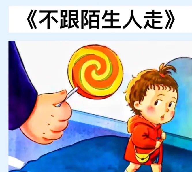 教师小结:陌生人可能有坏人,坏人会用好吃的食物、有趣的玩具,或者说好听的话骗小孩,把小孩骗走,使小孩再也不能回自己的家,所以我们不能随便相信陌生人的话,更不能跟陌生人走。