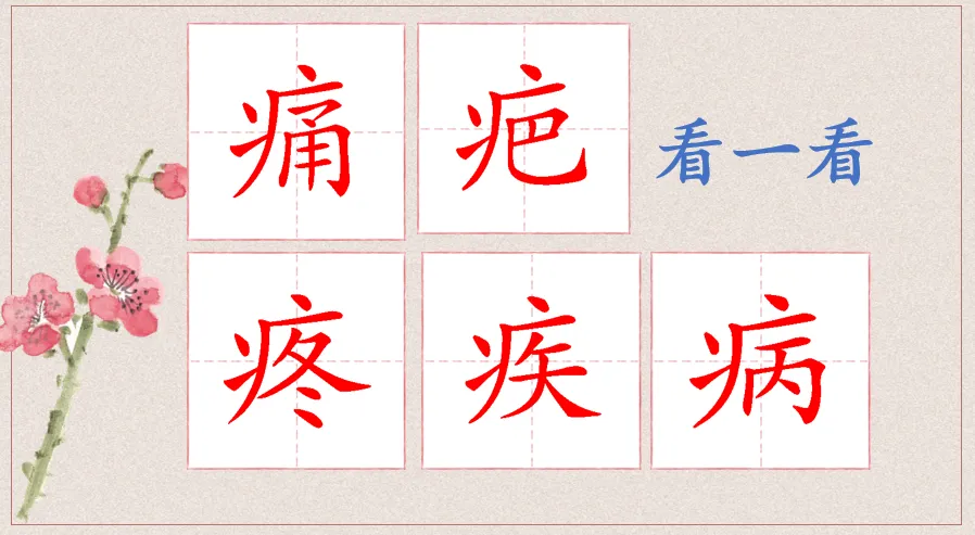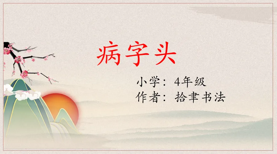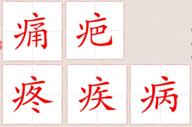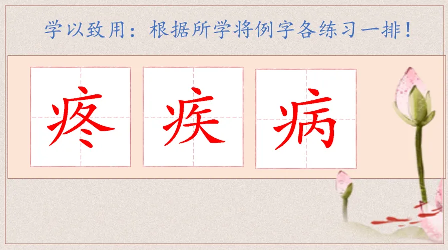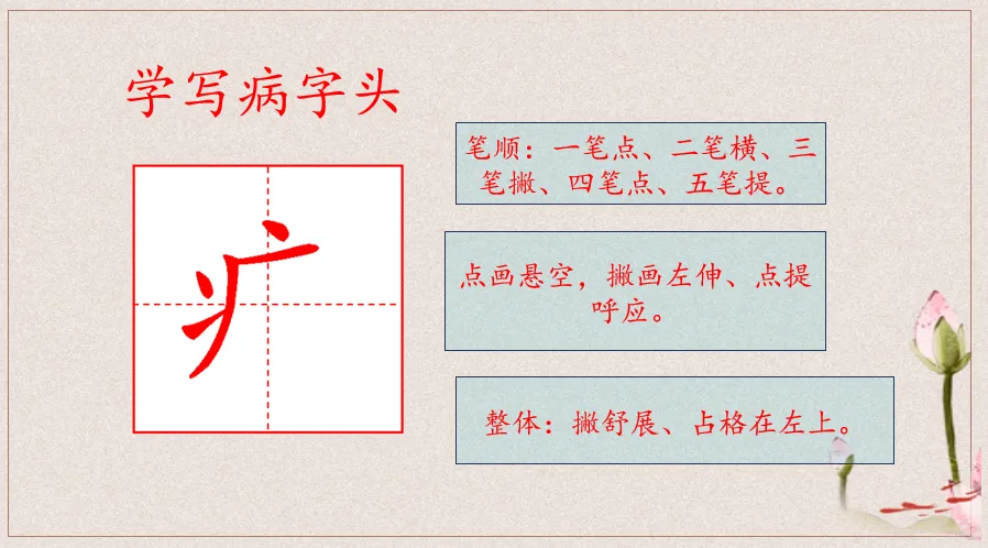 2.学写病字头。 (1)书写要点讲解: 笔顺:一笔点、二笔横、三笔撇、四笔点、五笔提整体:撇舒展、占格在上。点画悬空,撇画左伸、点提呼应。撇舒展、占格在左上。 (2)教师示范。 (3)学生书写。 3.“病字头”的运用。