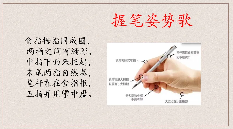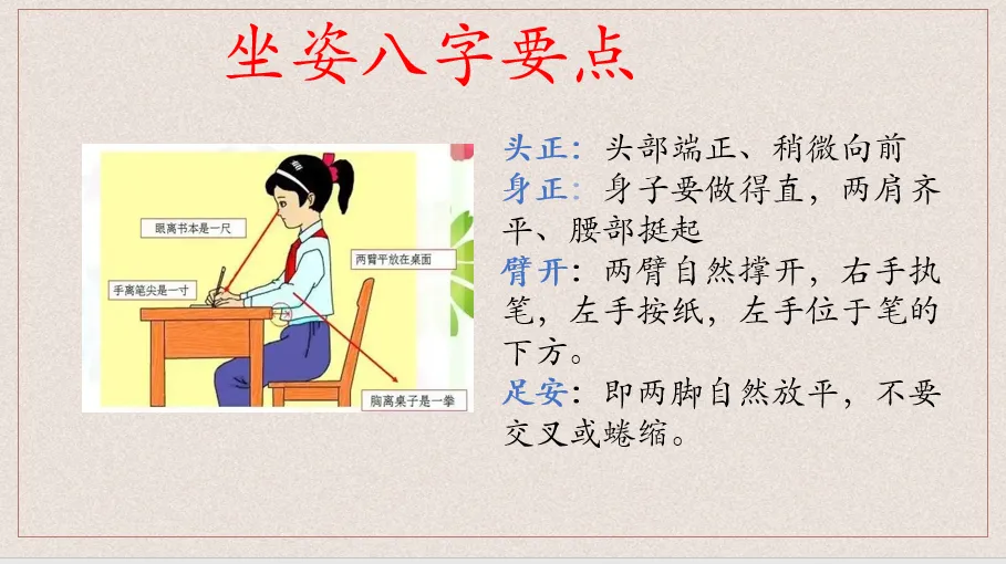 (设计目的:出示例字,引出“病字头”。) 二:标准的坐姿与握笔姿势(八字要点) 1.标准的坐姿,图片欣赏: (1)头正:头部端正、稍微向前 (2)身正:身子要做得直,两肩齐平、腰部挺起 (3)臂开:两臂自然撑开,右手执笔,左手按纸, (4)足安:即两脚自然放平,不要交叉或蜷缩。 2. 硬笔标准的握笔姿势。 食指拇指围成圆,两指之间有缝隙, 中指下面来托起,末尾两指自然卷, 笔杆靠在食指根,五指并用掌中虚。