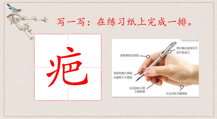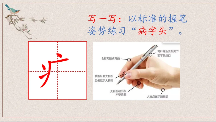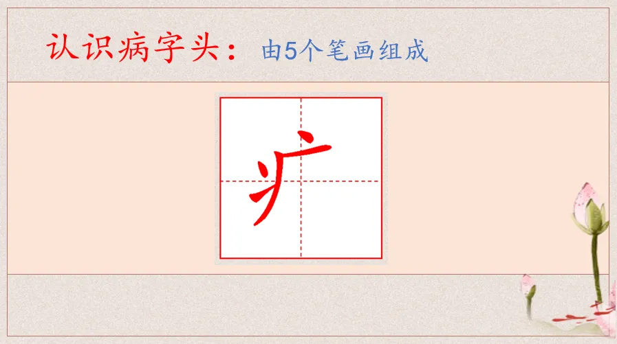 (设计目的:坐姿与握笔是写好字的关键,在入门时就强加规范和引导,有助于学生养成良好的习惯。) 三、书写 1.认识病字头:由5个笔画组成。
