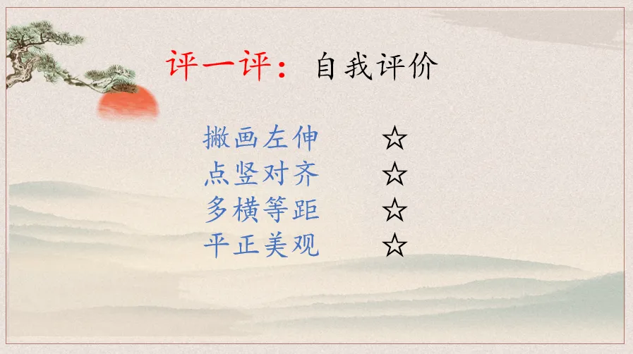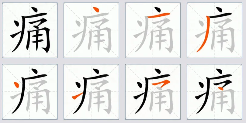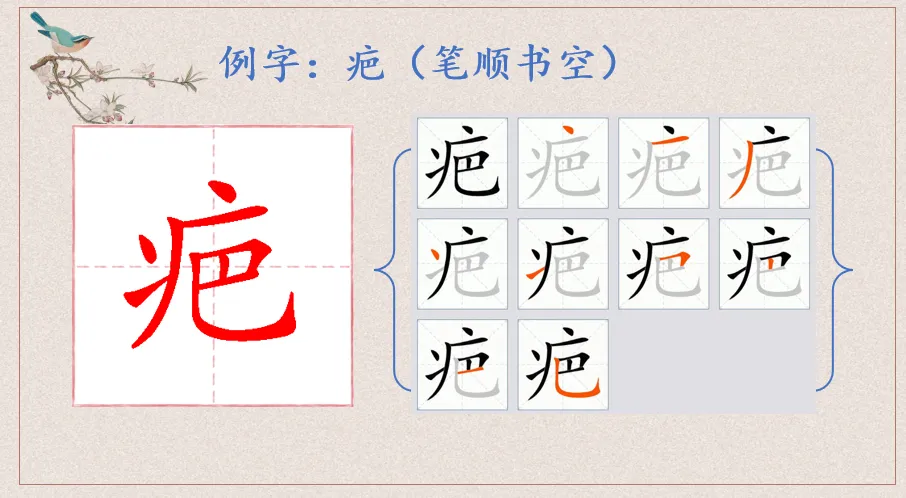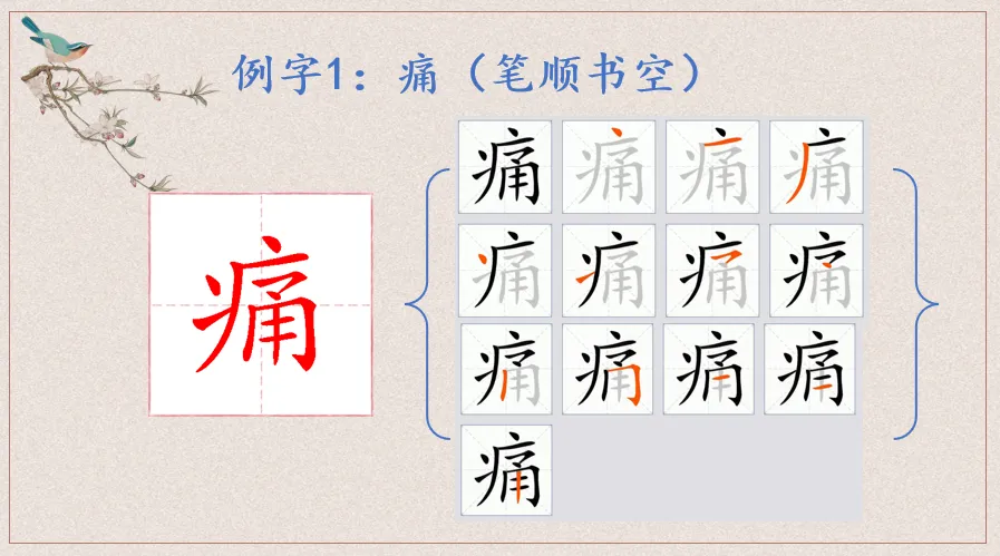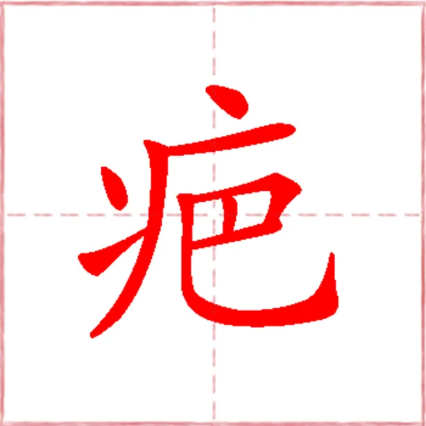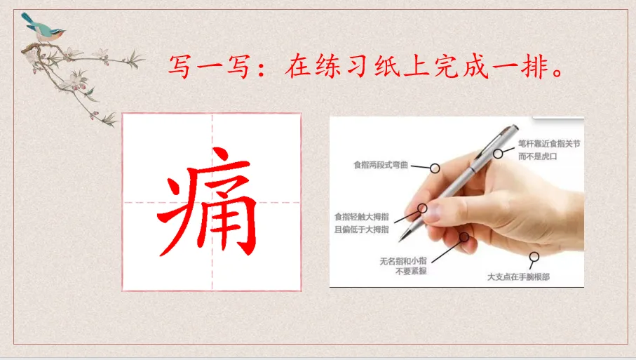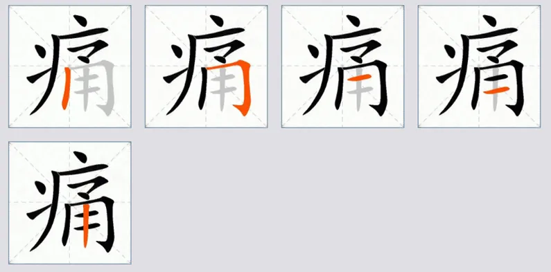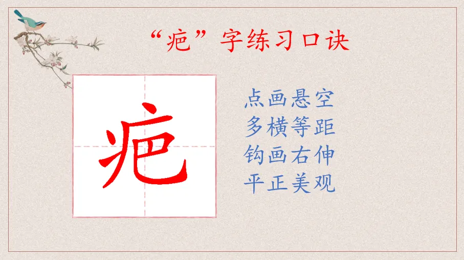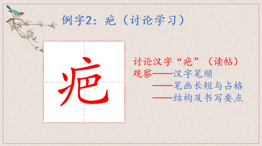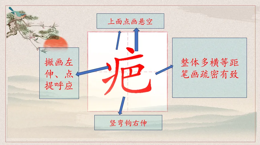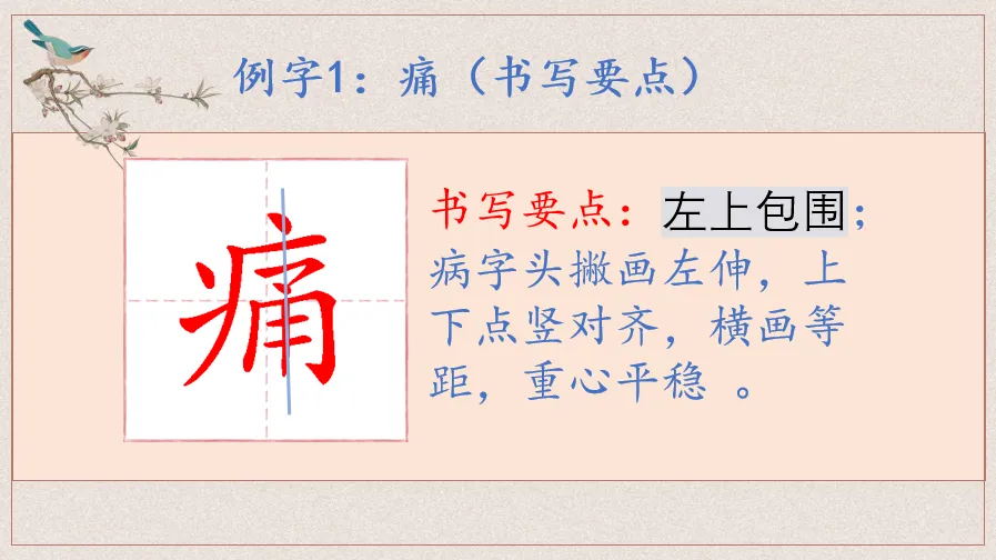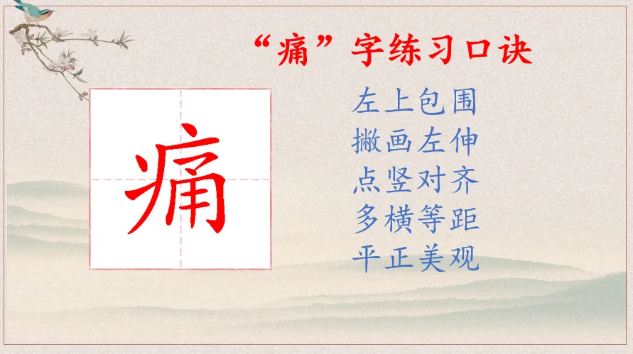 书写要点:左上包围;病字头撇画左伸,上下点竖对齐,横画等距,重心平稳。 (2)教师将“痛”字书写要点总结成口诀: 左上包围 撇画左伸 点竖对齐 多横等距 平正美观 4.教师示范。 5.学生练习与评价。 6.练习例字“疤”: