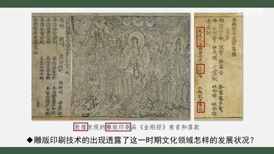 各位同学大家好。通过之前的学习,我们对隋唐时期政治、经济、民族关系、对外交流等方面的状况有了一定的了解。今天这节课我们就来说一说这一时期科技与文化的发展。请大家把书打开,让我们从一部1900年在我国敦煌莫高窟发现的《金刚经》开始说起。
