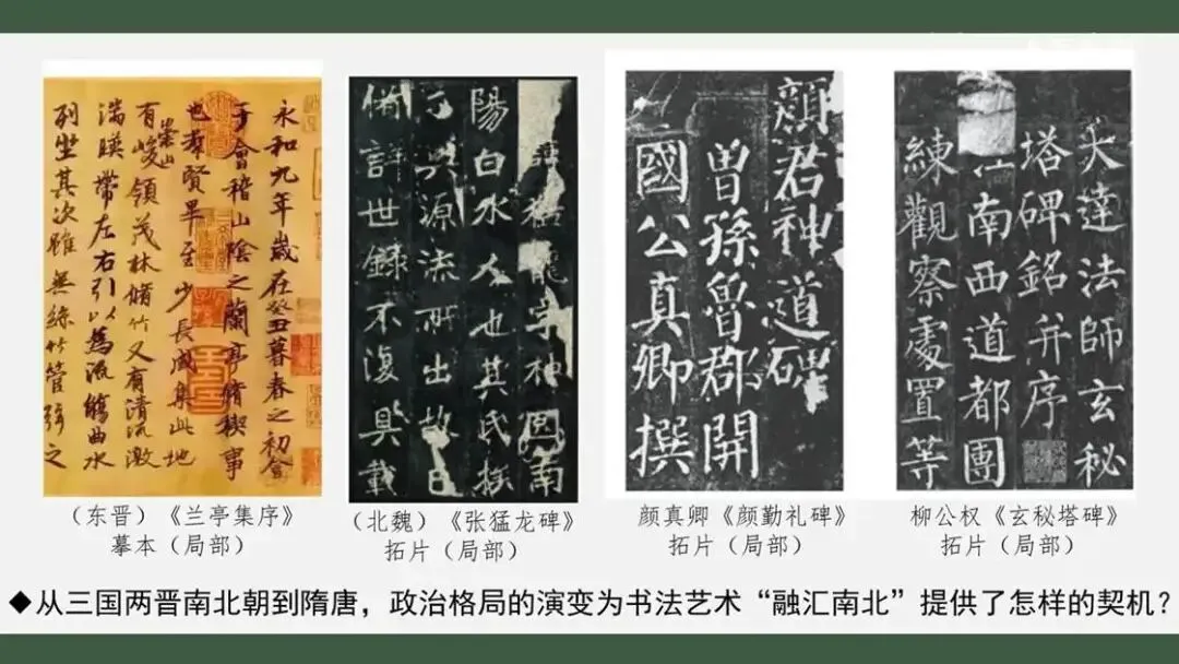 当时为何能形成新的书法风格呢?从魏晋南北朝到隋唐时期,政治格局的演变为书法艺术融汇南北提供了怎样的契机?隋唐时期,自东汉末年以来长期分裂的局面得以终结。政权的统一、统治者为巩固统一实施的一系列举措,为南北文化的交流与融合提供了有利条件。