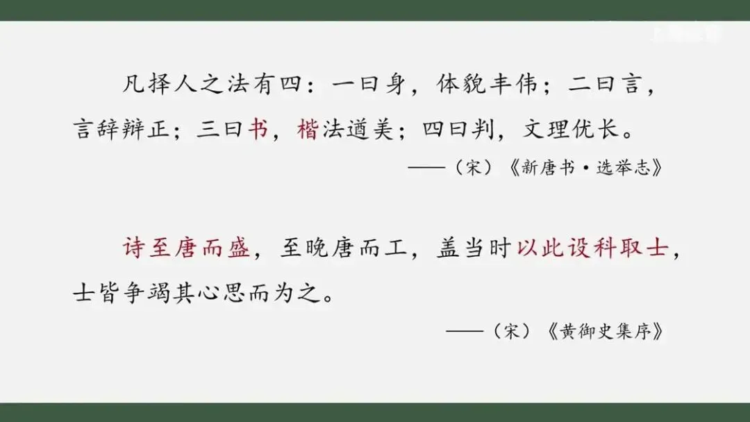 据史书记载,隋唐政府重视书法教育。唐朝更以书法——尤其是楷书的书写——作为选拔官员的标准之一,这极大推动了书法的普及和提高。同样受到选官制度推动的,还有唐朝诗歌的发展。