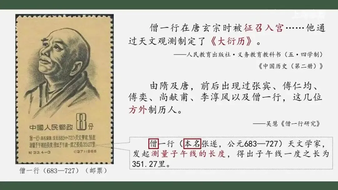从邮票的内容看,他本名是张岁,那为何他又叫僧一行呢?其实一行是他的法号,而”僧”则是表示他的身份——他是一位僧人。由隋至唐的历法编制中,相继出现了一批像僧一行这样的方外之士,他们的身份是道教的道士或佛教的僧侣,几乎掌控了隋唐近百年的历法史。