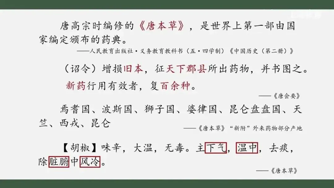 其实,新药物的不断传入,对新药物药效的总结,本身也是促成编修《唐本草》的重要原因。那《唐本草》对这类新药是如何描述的呢?我们可以看一则胡椒的片段:胡椒原产自印度和东南亚等地,在《唐本草》中称其主下气、温中、除脏腑中冷。“下气”、“温中”等词都是中医描述病症、药效的名词,这反映了当时对胡椒药性、药效的认识日益深入,这一步骤也日益融入传统中医药文化之中。