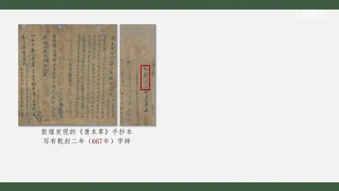据史书记载,《唐本草》一经成书很快颁布天下。1899年,在敦煌莫高窟中发现的《唐本草》手抄卷子本,背面有”乾封二年”(即公元667年)字样。
