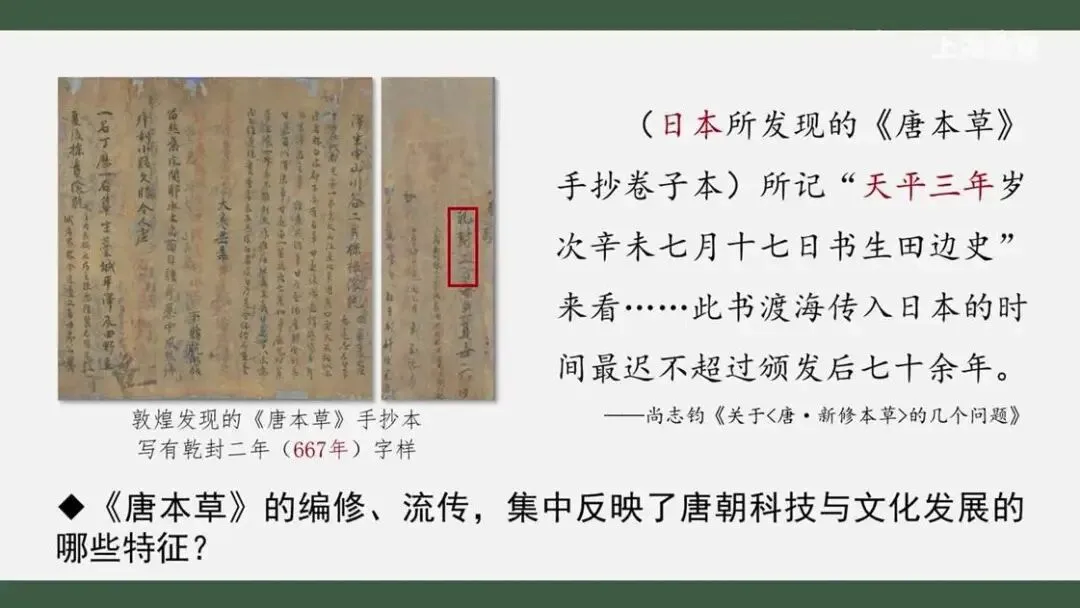 我们大致了解了《唐本草》的编修流传等状况。同学们能不能说说看,它的编修流传集中反映了唐朝科技与文化发展的哪些特征呢?