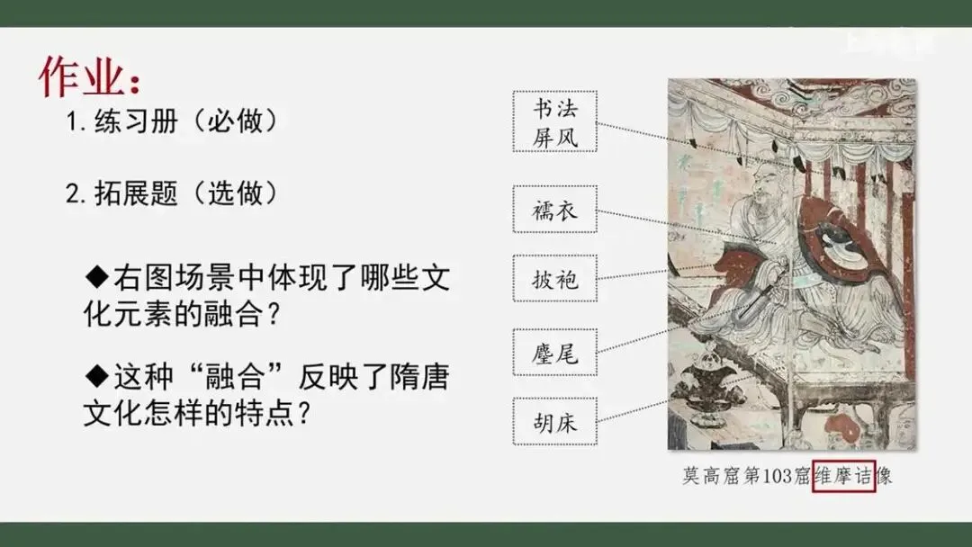 最后本课还有一个作业:请大家思考,莫高窟第103窟开凿于盛唐时期,窟内有一幅壁画描绘了佛教人物维摩诘的形象。