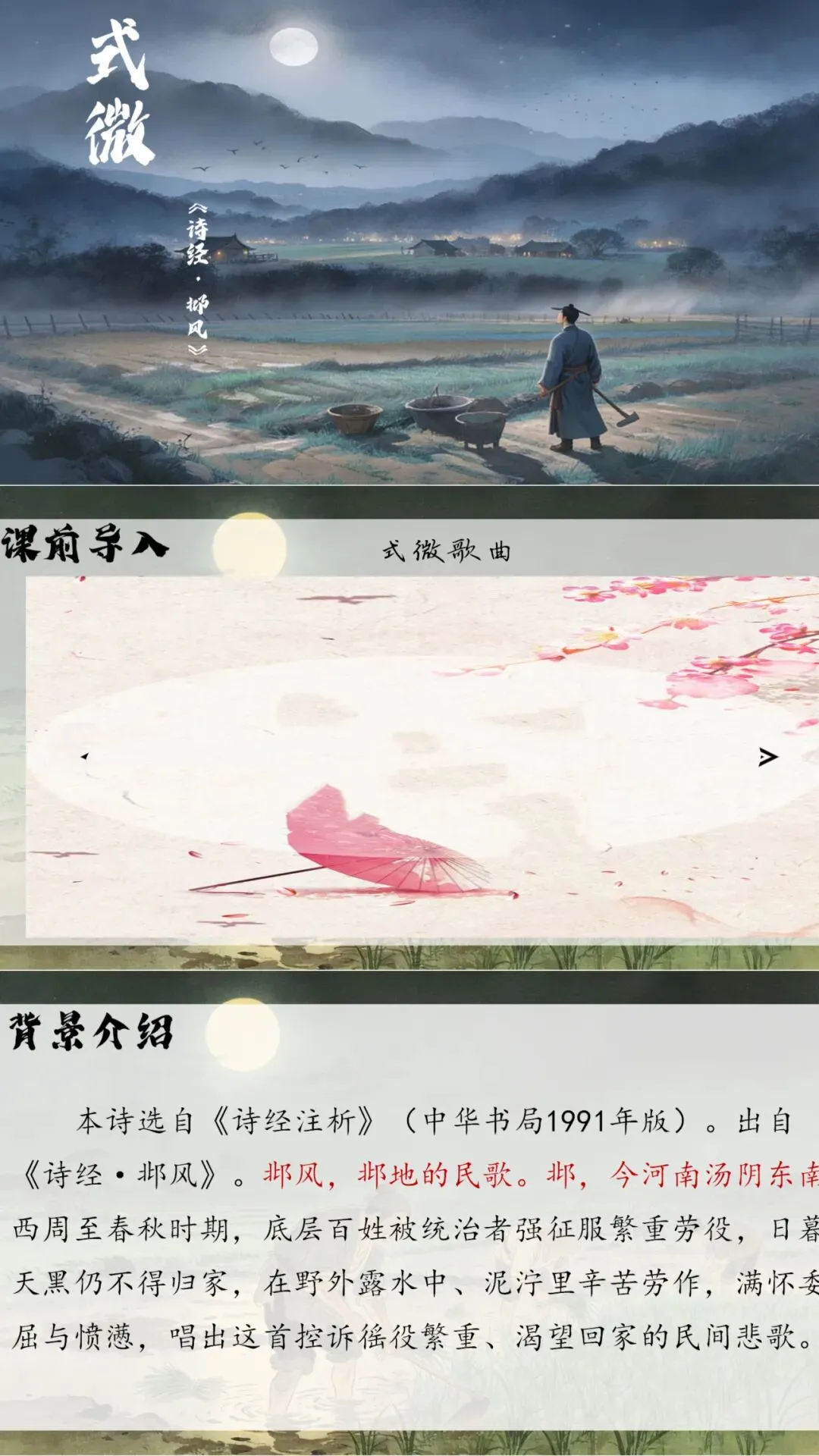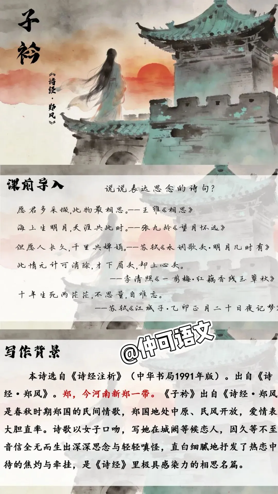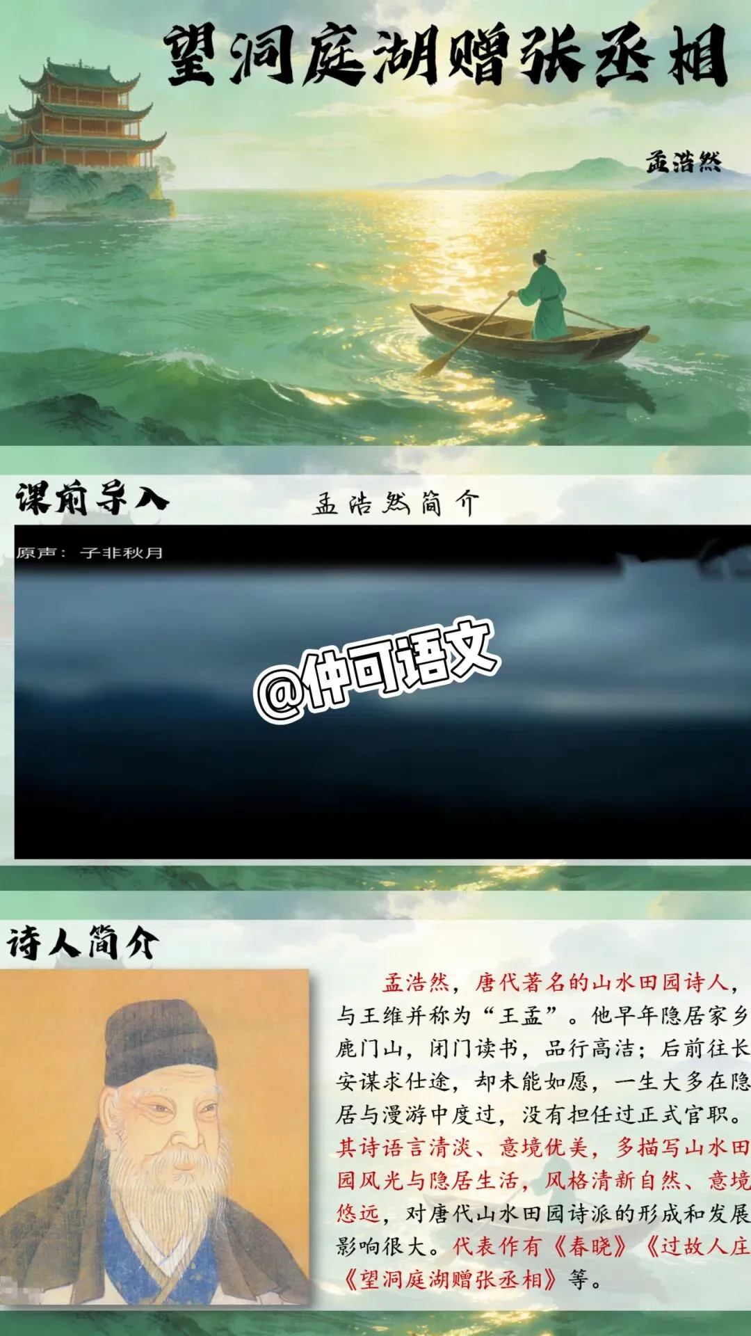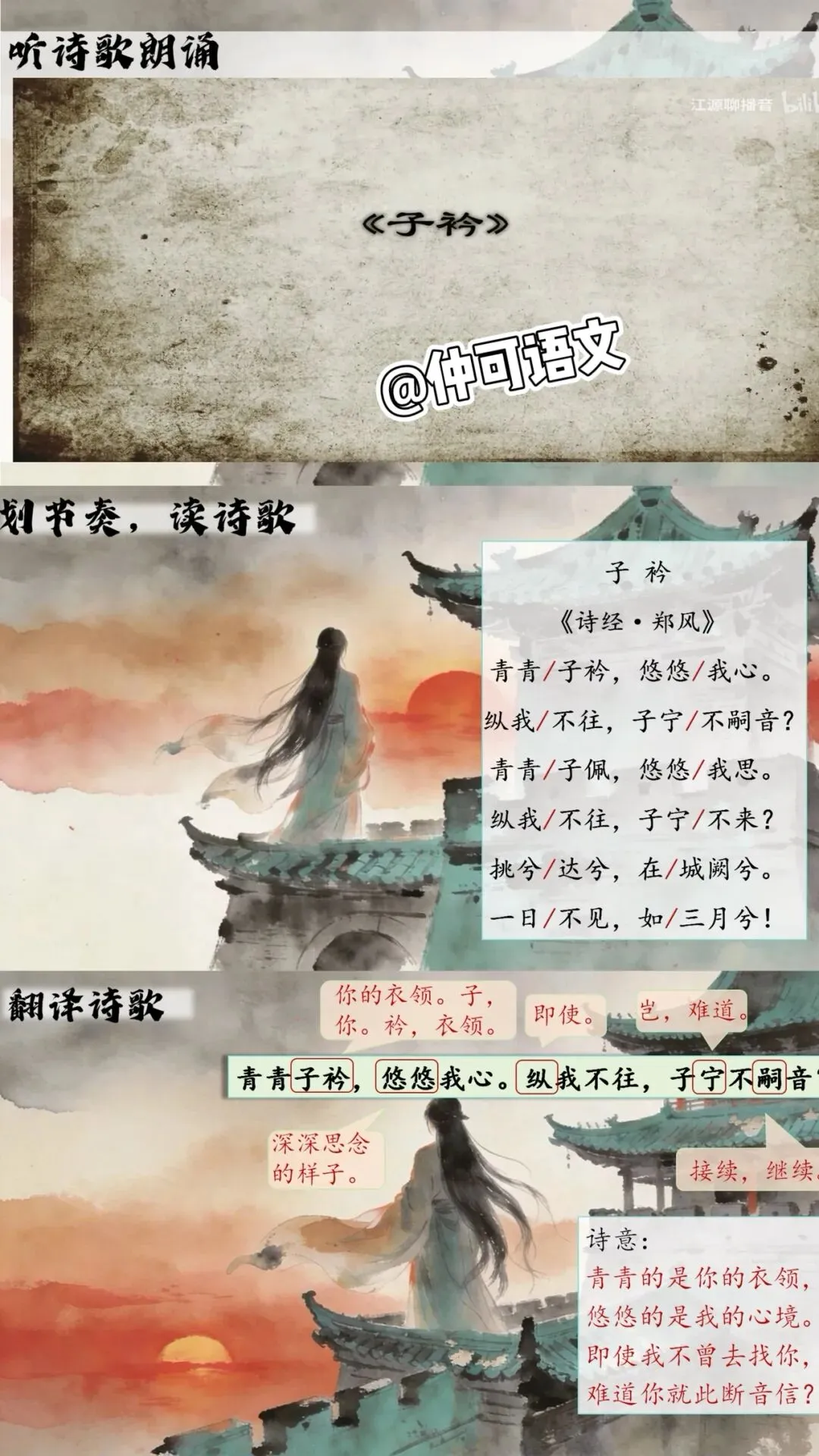 ❣️本课:仅课件 一共四首 共64页❣️每首诗歌都附带朗诵视频还有课前导入视频资料~ ❣️课件思路:导入,介绍作者、背景,听诗歌音频朗诵,划分节奏、读诗歌;接着就是翻译诗句,然后再以小组合作的方式去赏析诗歌,再概括主旨,最后有几道默写题练习哦🥳 ❣️诗歌篇目:《式微》《子衿》《送杜少府之任蜀州》《望洞庭湖赠张丞相》