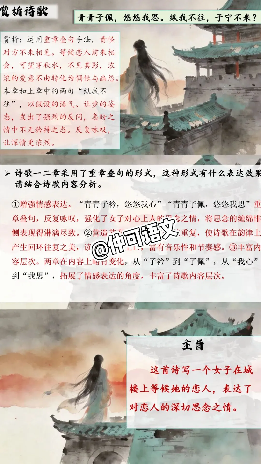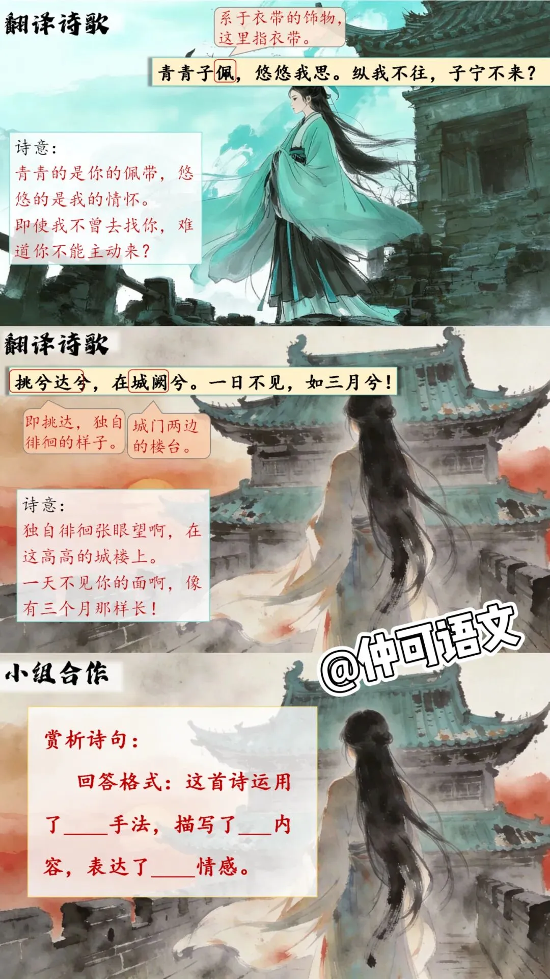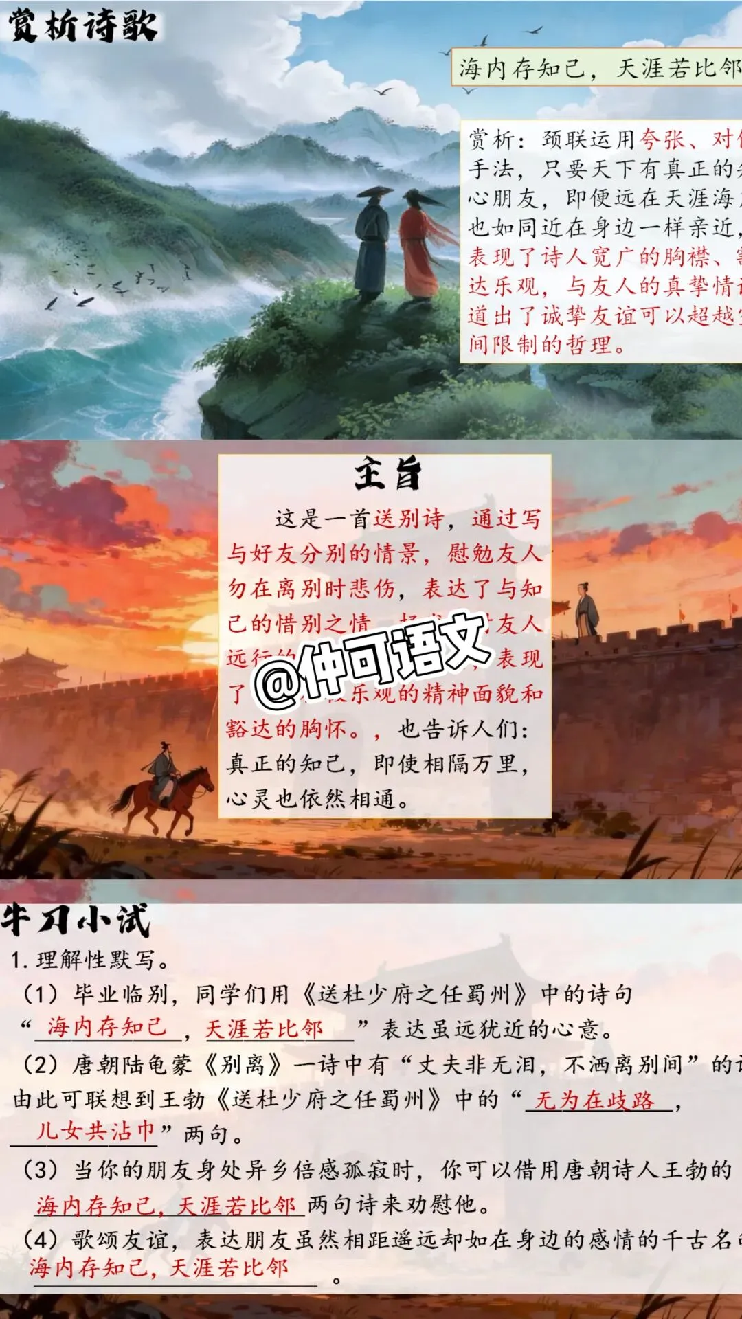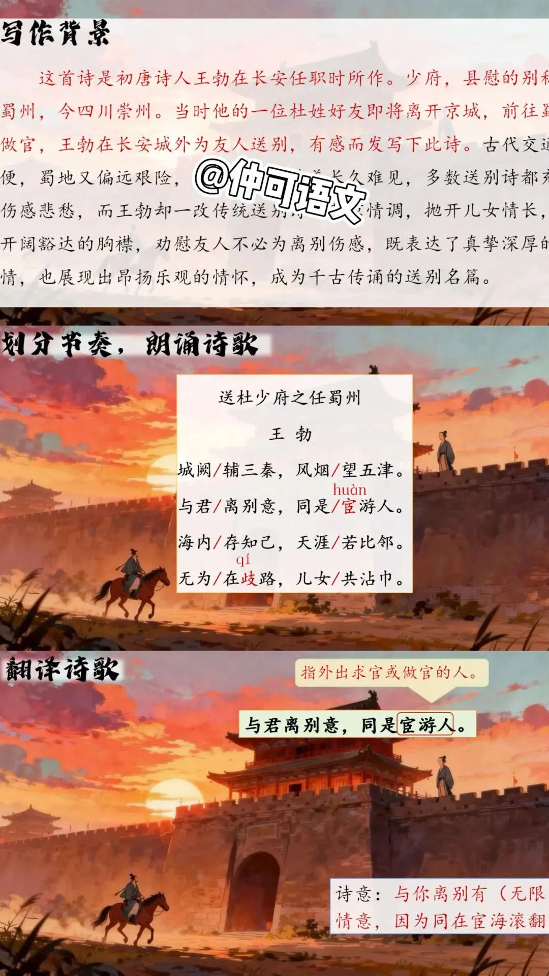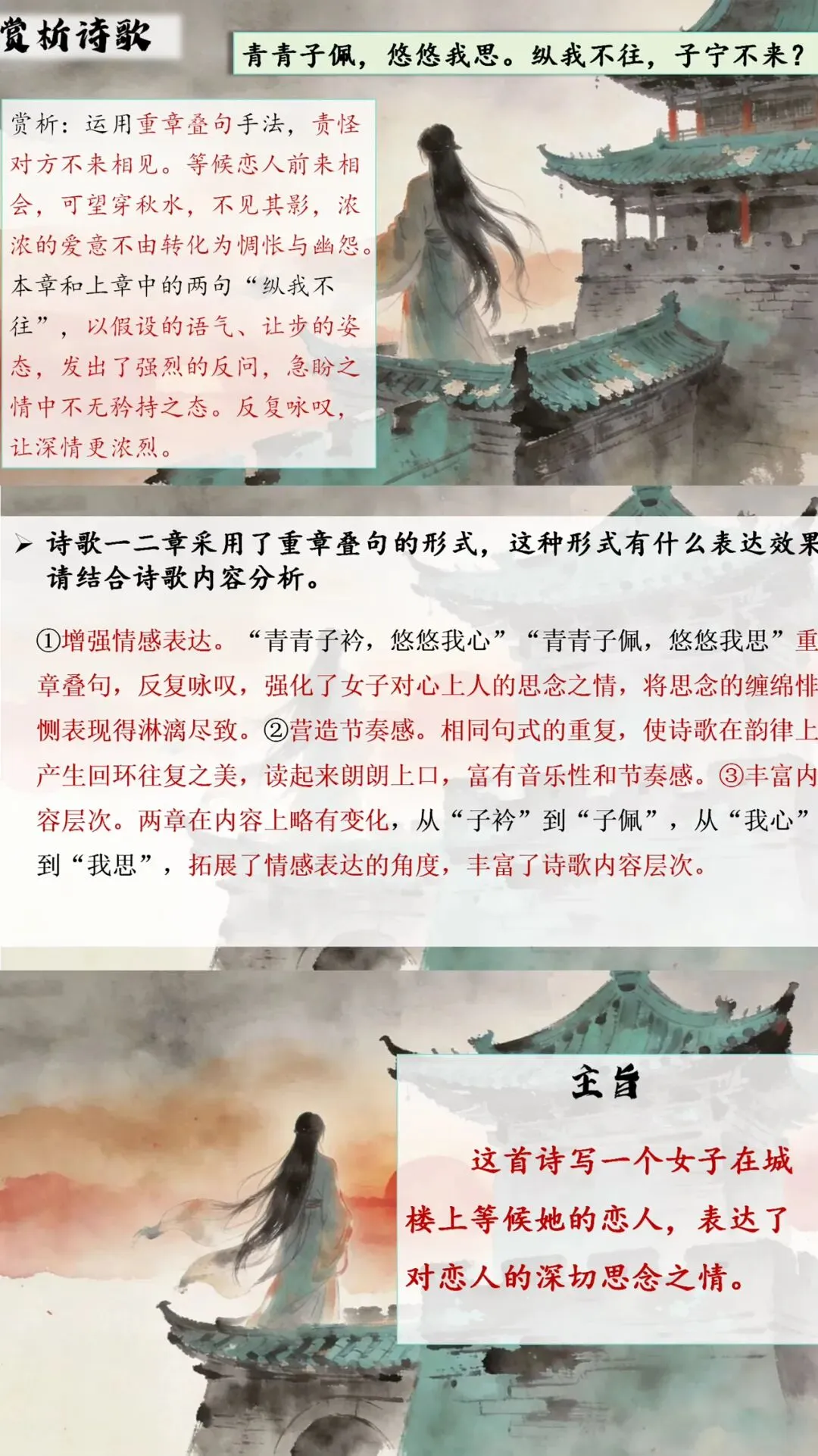❣️本课:仅课件 一共四首 共64页❣️每首诗歌都附带朗诵视频还有课前导入视频资料~ ❣️课件思路:导入,介绍作者、背景,听诗歌音频朗诵,划分节奏、读诗歌;接着就是翻译诗句,然后再以小组合作的方式去赏析诗歌,再概括主旨,最后有几道默写题练习哦🥳 ❣️诗歌篇目:《式微》《子衿》《送杜少府之任蜀州》《望洞庭湖赠张丞相》
