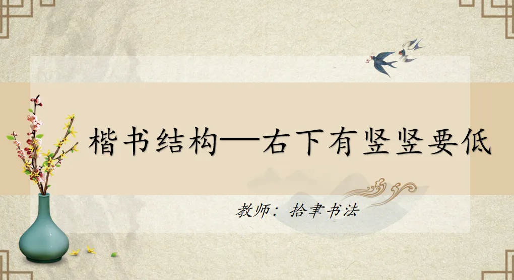 (设计目的:坐姿与握笔是写好字的关键,在入门时就强加规范和引导,有助于学生养成良好的习惯。) 三、新课讲授 1.认识结构规律“右下有竖竖要低”: 当汉字为左右结构,且右边部分的下方存在竖画(包括悬针竖、竖钩等)时,通常将右边的竖画起笔位置略低于左边部分的底部,形成左高右低的错位效果。这样做既能避免笔画过于对称呆板,又能通过高低变化增强字的动态平衡感,使整个字看起来更加舒展、自然。 2.规律的运用。