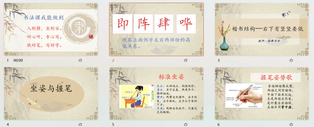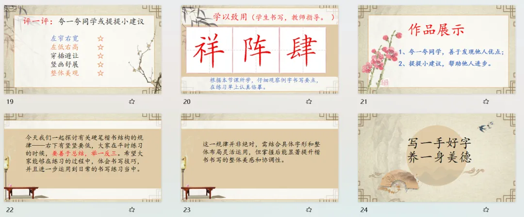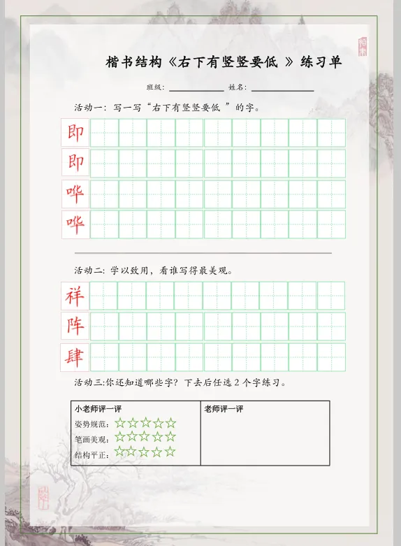 (设计目的:引导学生多练习相关例字。) 五、总结 今天我们一起探讨有关硬笔楷书结构的规律——右下有竖竖要低,大家在平时练习的时候,要善于总结,举一反三。希望大家能够在练习的过程中,体会书写技巧,并且进一步运用到日常的书写练习当中。这一规律并非绝对,需结合具体字形和整体布局灵活运用,但掌握后能显著提升楷书书写的整体美感和协调性。 (设计目的:回顾本节课所学,引导大家运用本节课知识写好更多的字。) 六、下课礼 下课啦,重师礼; 练习本,齐放好; 收工具,清桌面。 (设计目的:引导学生养成好的习惯。) |