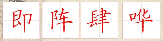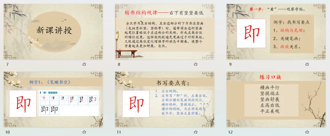 左右结构。 在书写“即”时,左高右低,左部分横向笔画间距均匀,横折稍斜,竖提端正。“卩”横折钩稍短,与左部底端大致平齐,竖画正直舒展。 (2)书写要点总结成口诀: 横画平行 竖提端正 竖画舒展 左高右低 平正美观 3.教师示范。 4.学生练习与评价;完成活动1前两排。 5.练习例字2: