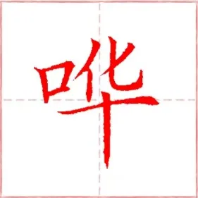 (1)学生观察汉字(读帖) 观察——汉字笔顺 ——笔画长短与占格 ——结构及书写要点 (2)教师总结书写要点: 左右结构。 在书写“哗”时,“口”位置偏左上,上宽下窄,大小适中。“华”上边左窄右宽,竖弯钩圆转自然;下边横画宜长,竖画正中直下。 (3)教师示范。 (4)学生书写。 (设计目的:这一部分是本节课的重点,讲解楷书结构规律“右下有竖竖要低”的含义,并引导学生美观书写例字,从笔顺、书写要点讲解,清晰直观,引导学生学以致用。) 四:学以致用,写一写。