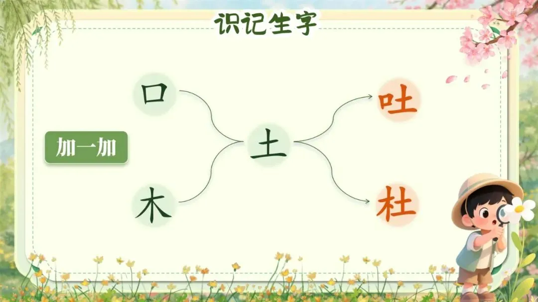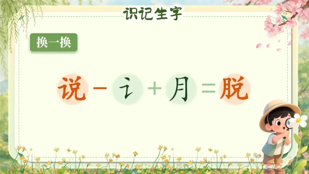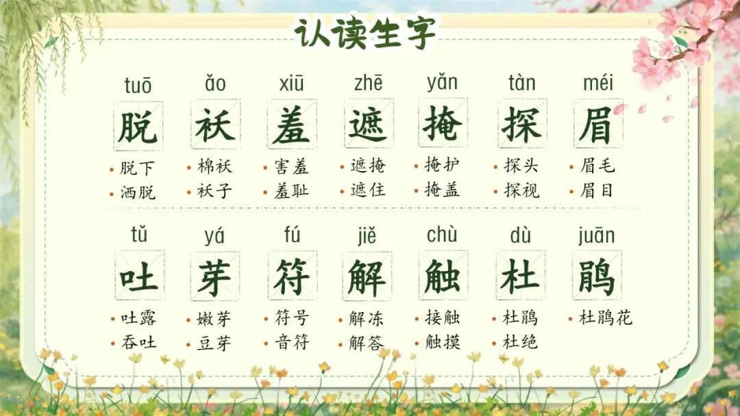 1.识字写字:认识"脱、袄、遮、掩、探、眉、吐、芽、符、解、触、杜、鹃"14个生字;会写"冲、寻、眉、吐、闻、柳、荡、桃"8个字;会写"春天、寻找、眉毛、野花、柳枝、桃花"等词语。