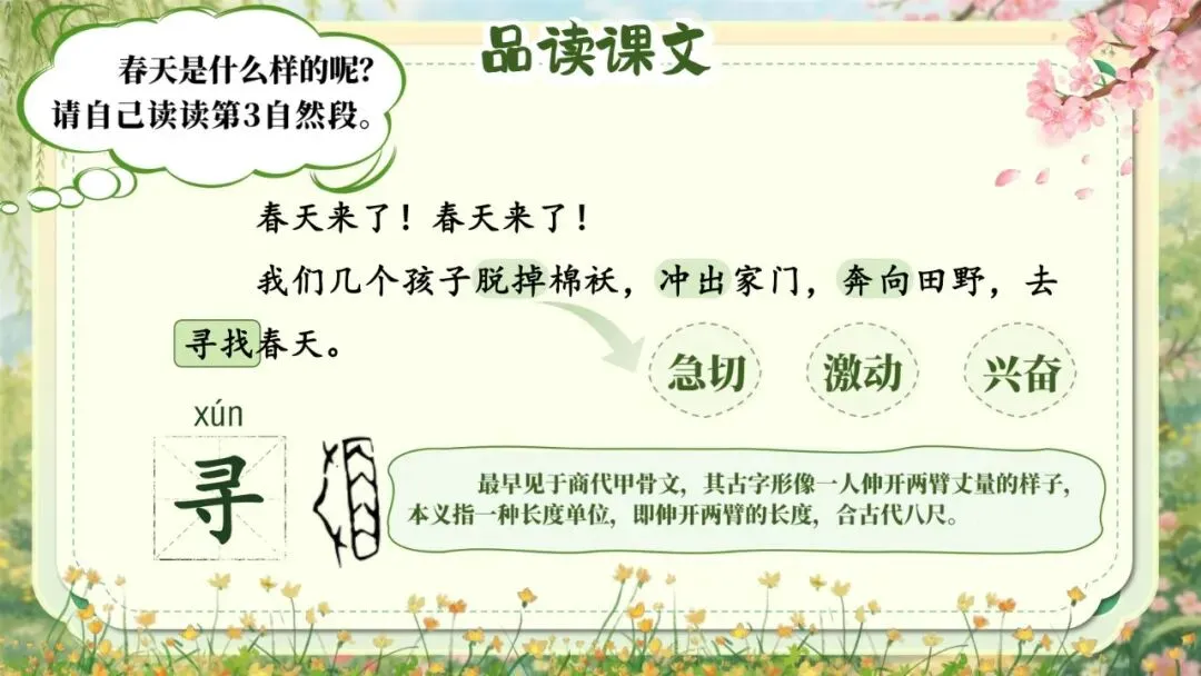 师:(借助图片理解"寻")"寻"最早见于商代甲骨文,其古字形像一人伸开两臂丈量的样子,本义指一种长度单位,即伸开两臂的长度,合古代八尺。课文中我们几个孩子张开双臂,一寸一寸,一点一点地找春天呢!
