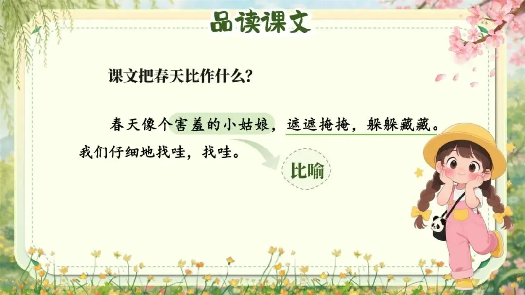 师:对!这是早春时节,春天像个害羞的小姑娘,遮遮掩掩,躲躲藏藏。我们要仔细地找,才能发现她。
