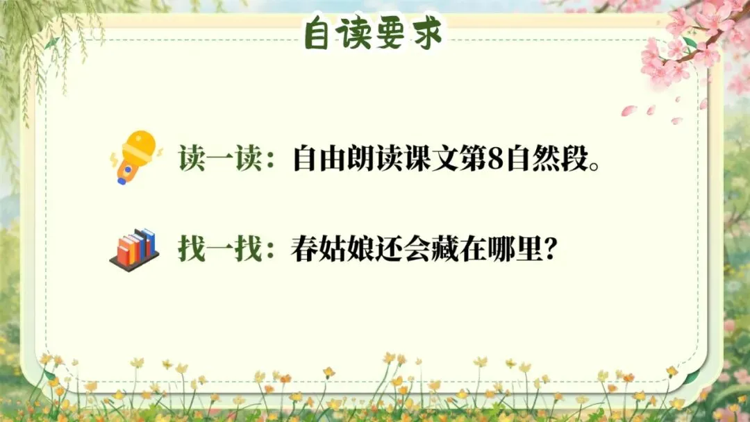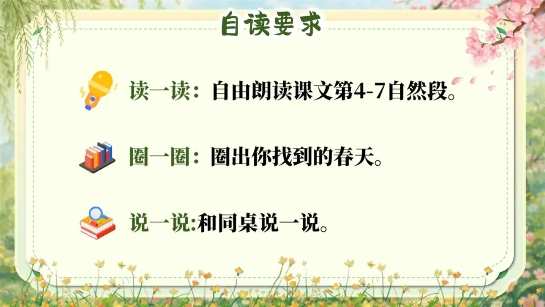 3.理解表达:能说出文中孩子们找到的春天是什么样的;能仿照第4-7自然段或第8自然段说一说自己发现的春天。