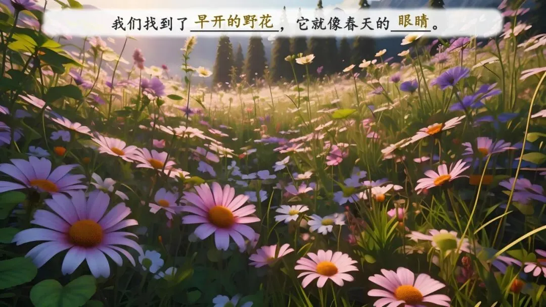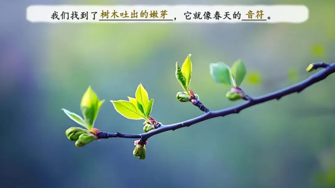 师:春天小使者们,今天我们完成了任务二——寻找田野里的春天。我们找到了春天的眉毛、眼睛、音符、琴声,还学会了用美丽的语言描写春天。