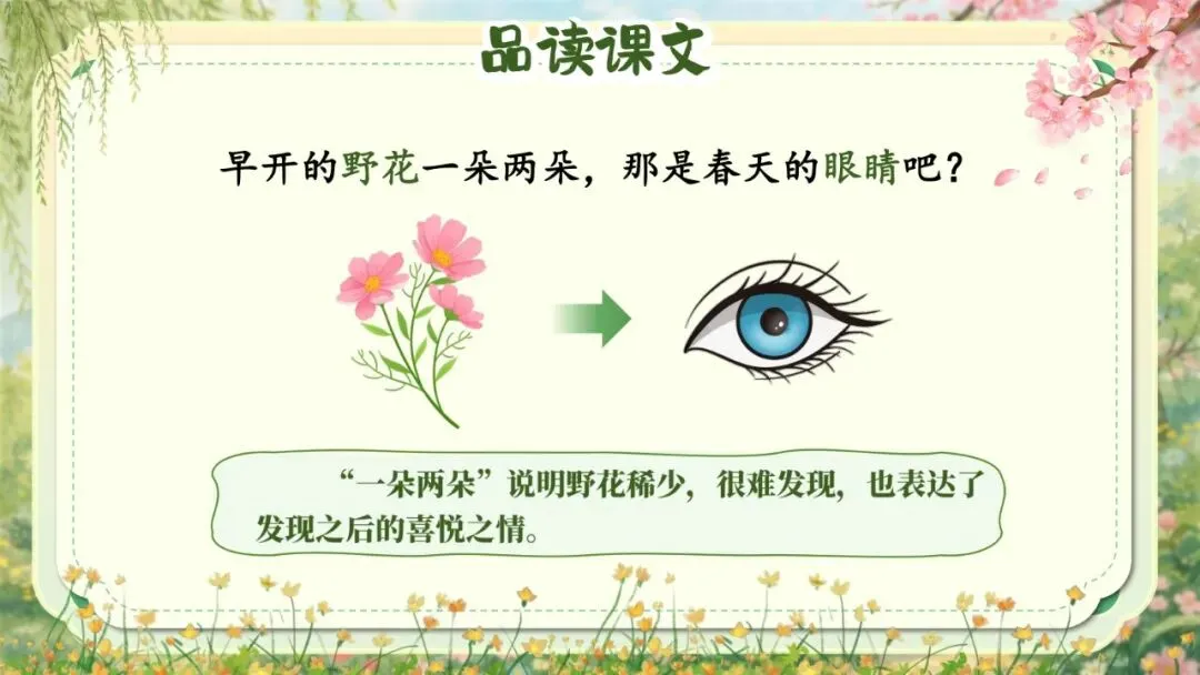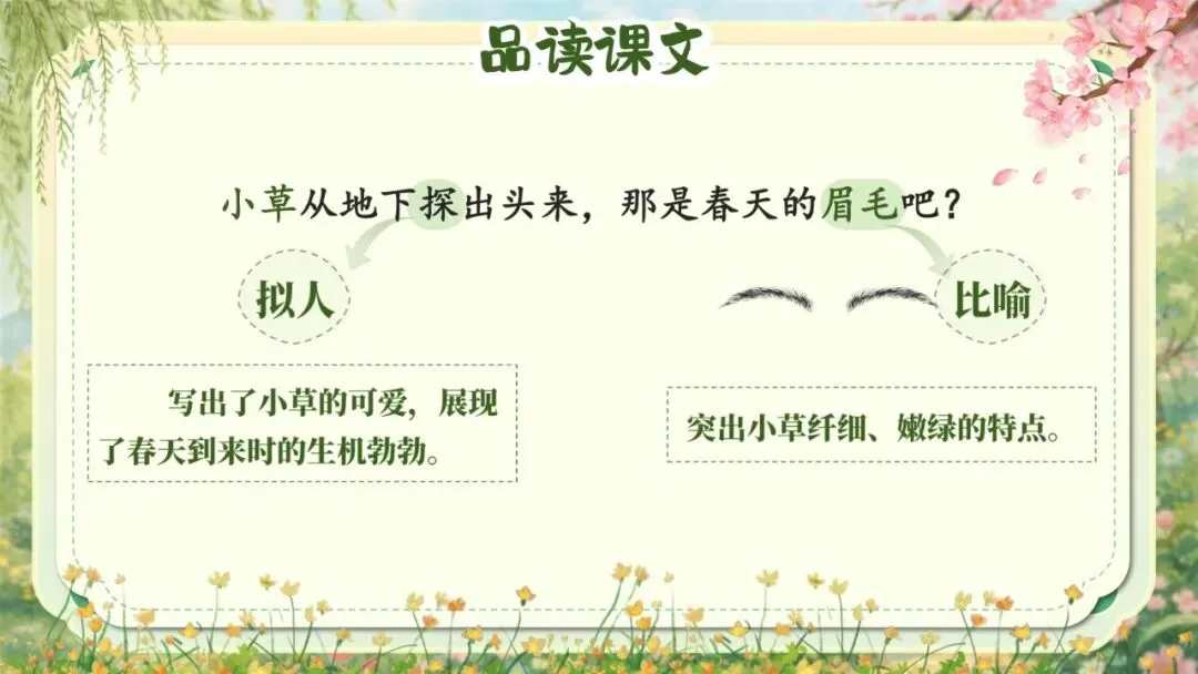 生:因为"探出头来"是小草的动作,很可爱;"眉毛"是把小草比作春天的眉毛,很有趣。