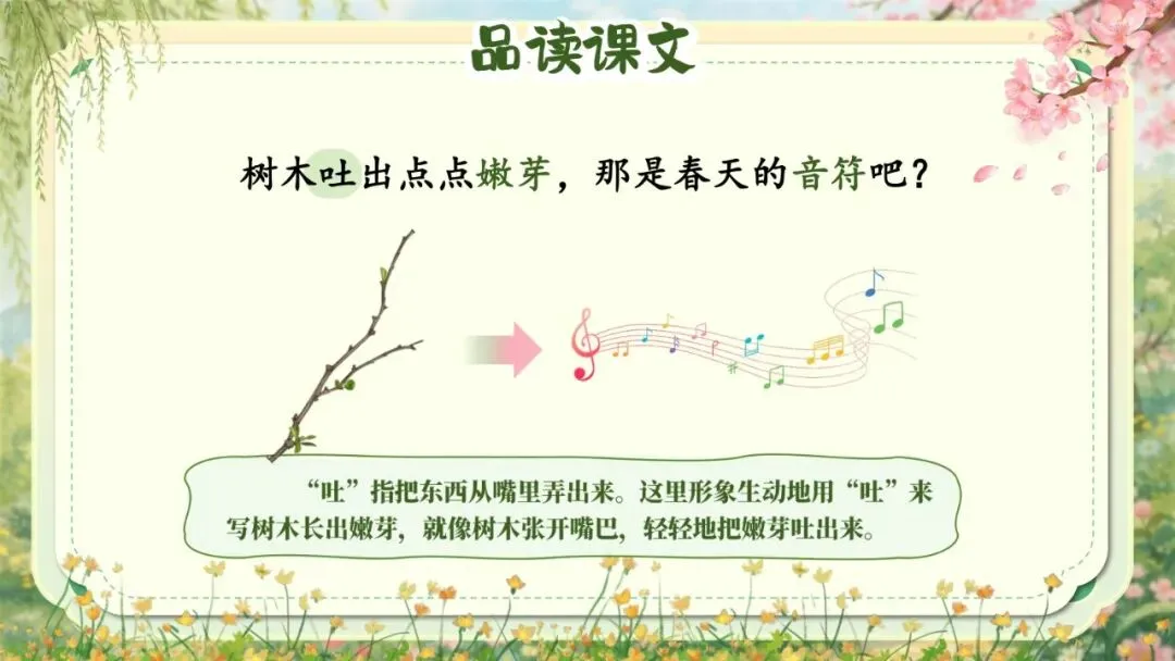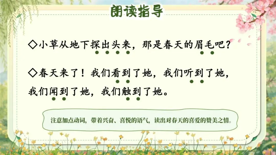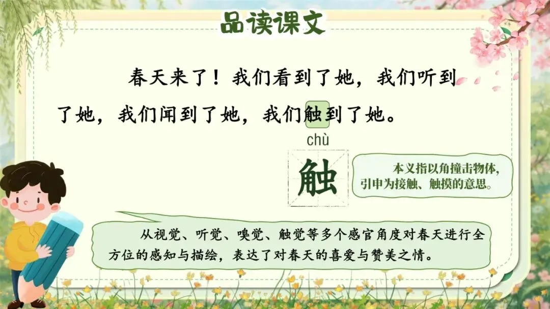 师:这段话从视觉、听觉、嗅觉、触觉等多个感官角度对春天进行全方位的感知与描绘,表达了对春天的喜爱与赞美之情。