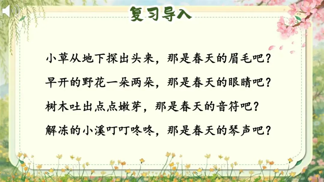 师:春天小使者们,上两节课我们完成了任务一,跟着诗人贺知章和高鼎找到了古诗里的春天。还记得他们眼中的春天是什么样的吗?