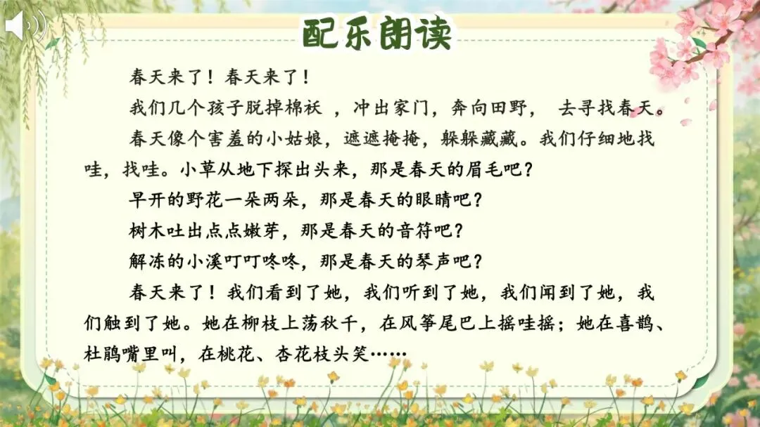 师:让我们配上音乐,把整篇课文美美地读一遍,感受春天的美好!
