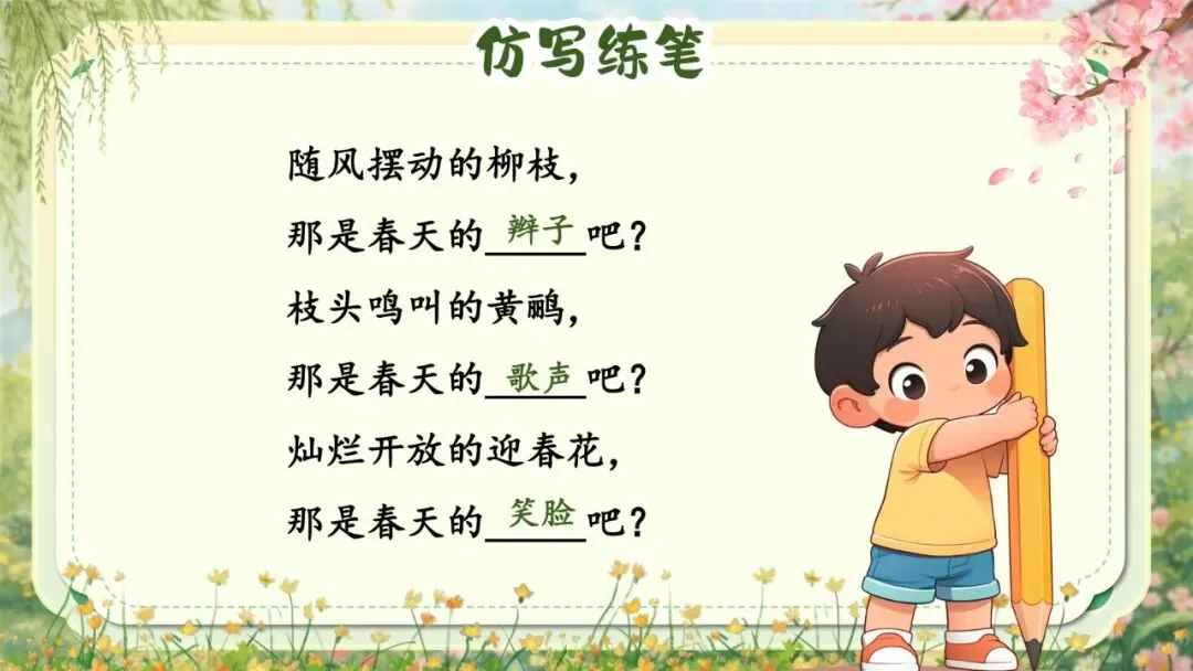 随风摆动的柳枝,那是春天的_____吧?枝头鸣叫的黄鹂,那是春天的_____吧?灿烂开放的迎春花,那是春天的_____吧?