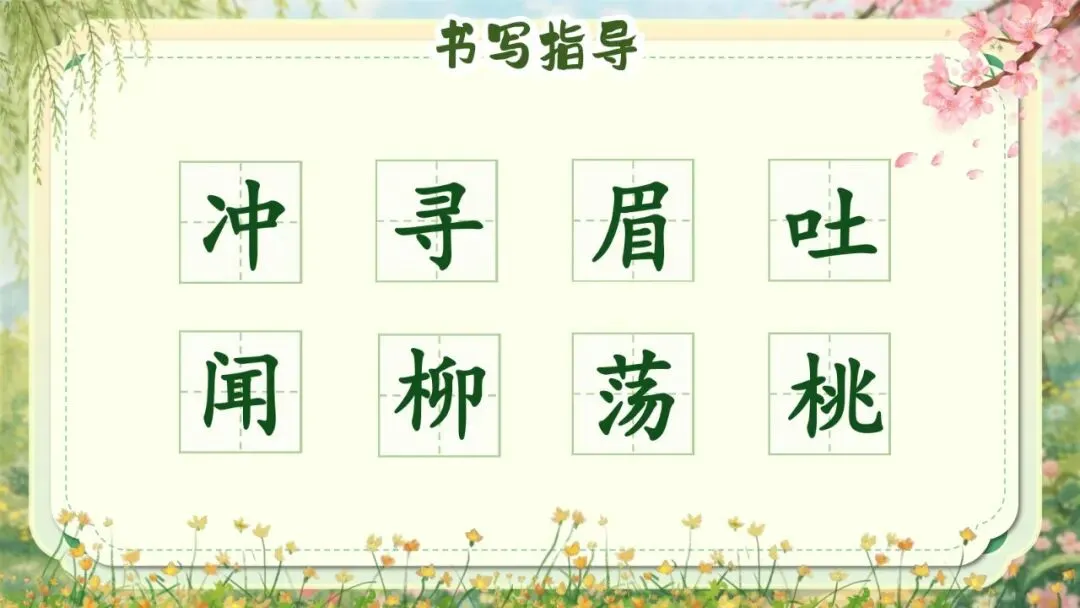 •书写指导细致:重点指导"眉、柳、荡"等字的书写,结合语文园地的"书写提示",强调左上包围字的撇画要舒展。