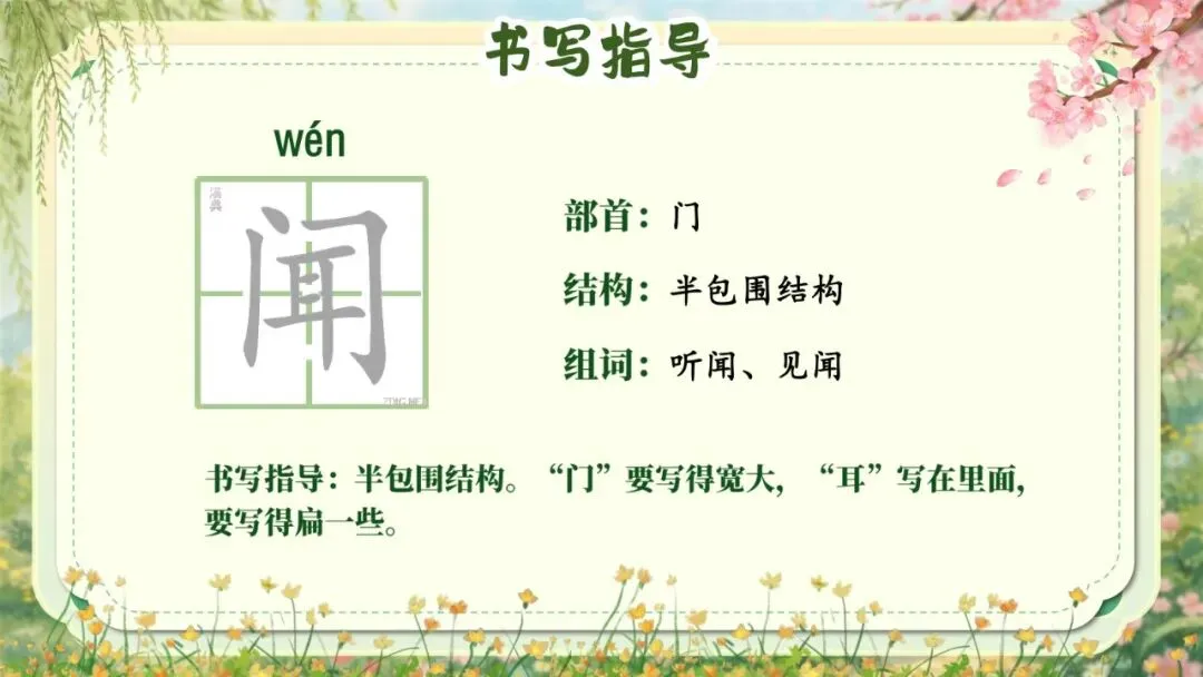 闻:半包围结构。"门"要写得宽大,"耳"写在里面,要写得扁一些。