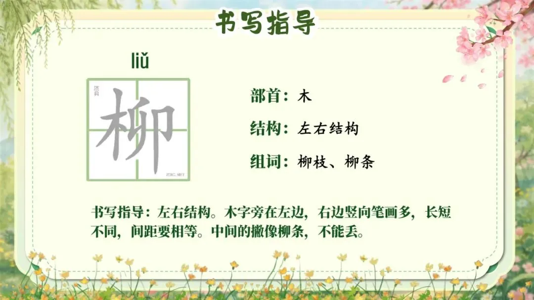 柳:左右结构。木字旁在左边,右边竖向笔画多,长短不同,间距要相等。中间的撇像柳条,不能丢。