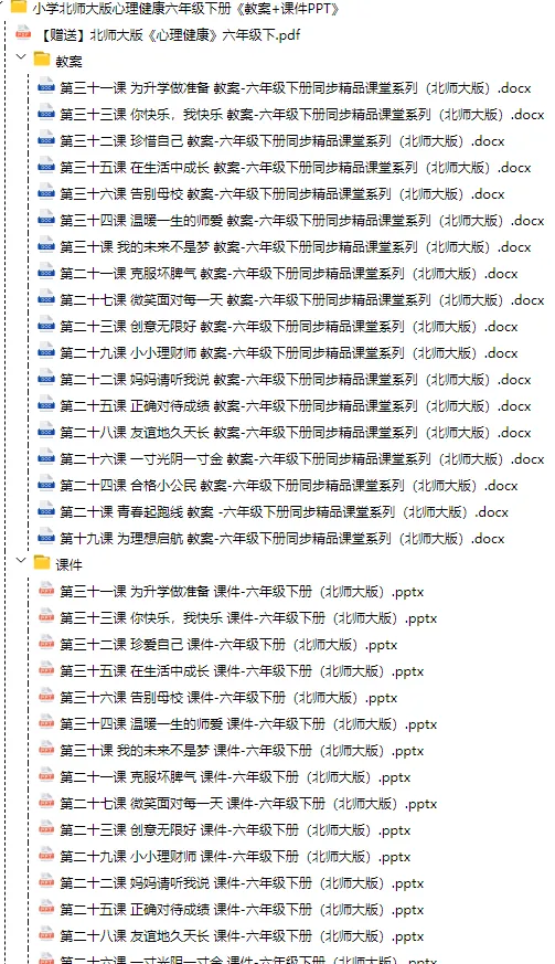 当前位置:首页>教案>小学心理健康六年级下册 教案+课件PPT(北师大版),可下载打印!
