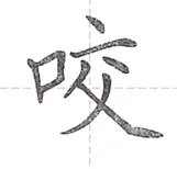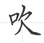 (1)书写要点讲解: 吹:一笔竖,二笔横折,三笔横,四笔撇、五笔横撇、六笔撇、七笔捺。 书写要点:左右结构,左窄右宽,口字旁居于左上方写,右边撇画高,撇收捺放。撇画穿插到口的下面补空。 (2)教师将“吹”字书写要点总结成口诀: 左窄右宽 口居左上 撇收捺放 穿插补空 平正美观 (3)教师示范。 (4)学生练习。 (5)评价。