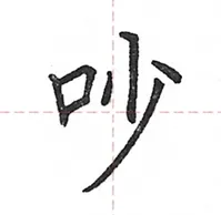 (1)学生观察汉字“吵”(读帖) 观察——汉字笔顺 ——笔画长短与占格 ——结构及书写要点 (2)教师将“吵”字书写要点总结成口诀: 左窄右宽 左高右低 口居左上 竖画最高 撇画左伸 (3)教师示范。 (4)学生书写。 (设计目的:这一部分是本节课的重点,讲解“口字旁”的写法,从起笔、行笔、收笔讲解书写要点,清晰直观,练习相关例字,引导学生学以致用。) 三:学以致用,写一写。   (设计目的:引导学生多练习相关例字。) 四:观察与发现。