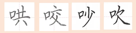 口字旁的字,口字居于左上,右部笔画穿插补空。 五、总结 今天我们学习了口字旁,同学们写的很认真,下去之后找到相关的例字,多练习,通过练习,同学们能把字写的越来越好,进步越来越大。 六、下课礼 下课啦,重师礼; 练习本,齐放好; 收工具,清桌面。 (设计目的:引导学生养成好的习惯。) | 调整坐姿, 准备工具, 认真听讲。 认真倾听老师讲解,观察图片,理解坐姿八字要点,对应调整。 复习标准的握笔姿势。 朗读握笔姿势歌(理解记忆)。 仔细观察。 学习“口字旁”的书写要点。 观察老师示范,理解记忆。 观察思考“吹”字的书写要点。观察老师示范,理解记忆。 书写。 对比自己的练习,发现优点与不足。 观察思考“吵”字的书写要点。 自主练习“哄、咬”。 对比思考。 整理物品, 归位桌椅。 |