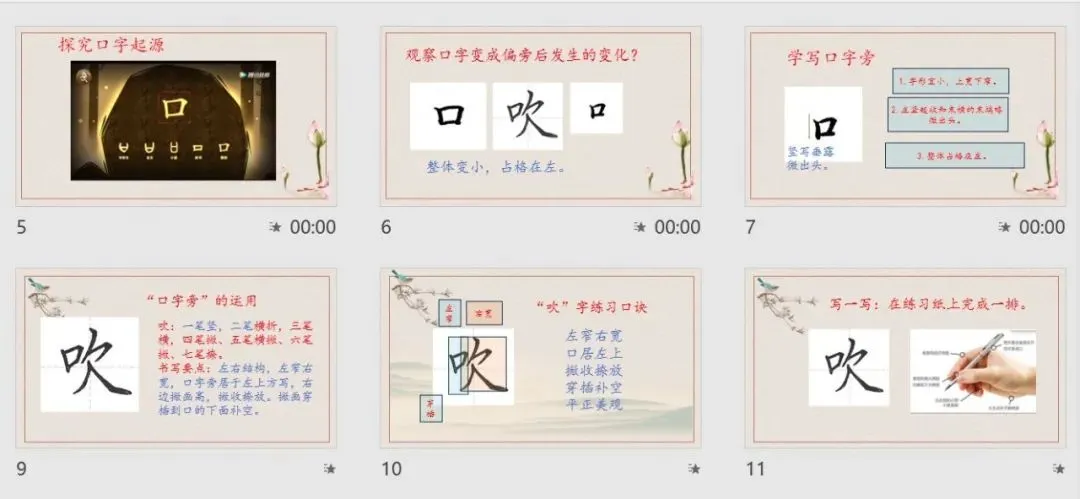 准备:课堂常规 入则静,坐则安。 耐心听,专心写。 执好笔,写好字。 (设计目的:指定一些简单的口号,有利于课堂秩序的引导,让课堂更有效的进行。) 一、标准的坐姿与握笔姿势(八字要点) 1.标准的坐姿,图片欣赏: (1)头正:头部端正、稍微向前 (2)身正:身子要做得直,两肩齐平、腰部挺起 (3)臂开:两臂自然撑开,右手执笔,左手按纸, (4)足安:即两脚自然放平,不要交叉或蜷缩。 2. 硬笔标准的握笔姿势。 食指拇指围成圆,两指之间有缝隙, 中指下面来托起,末尾两指自然卷, 笔杆靠在食指根,五指并用掌中虚。 (设计目的:坐姿与握笔是写好字的关键,在入门时就强加规范和引导,有助于学生养成良好的习惯。)  二、笔画的书写 1. 学写“口字旁”。 (1)探究口字起源(播放视频) 我发现双人旁是在单人旁上再加上一个更小的短撇。 (2)观察口字变成偏旁后发生的变化?