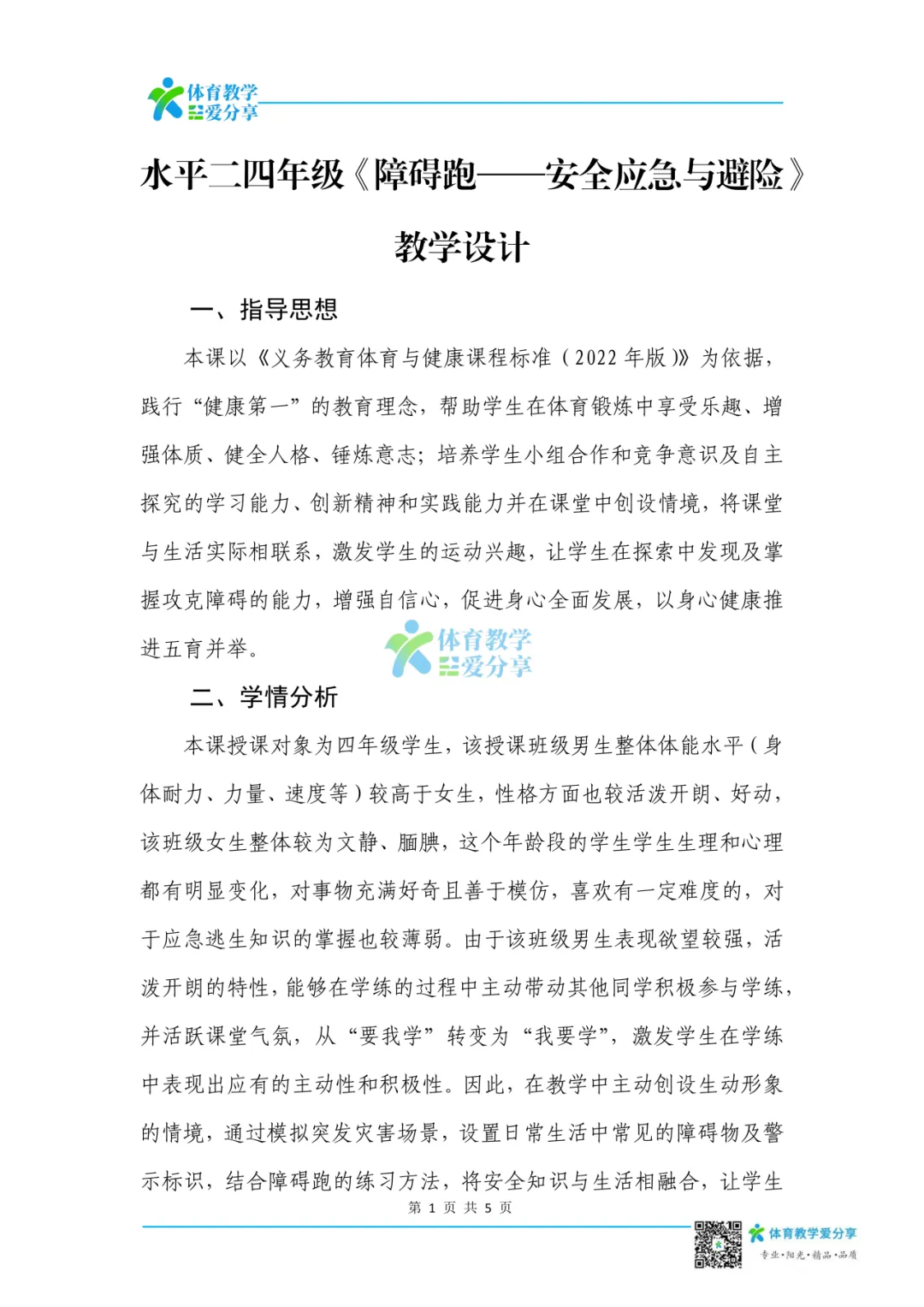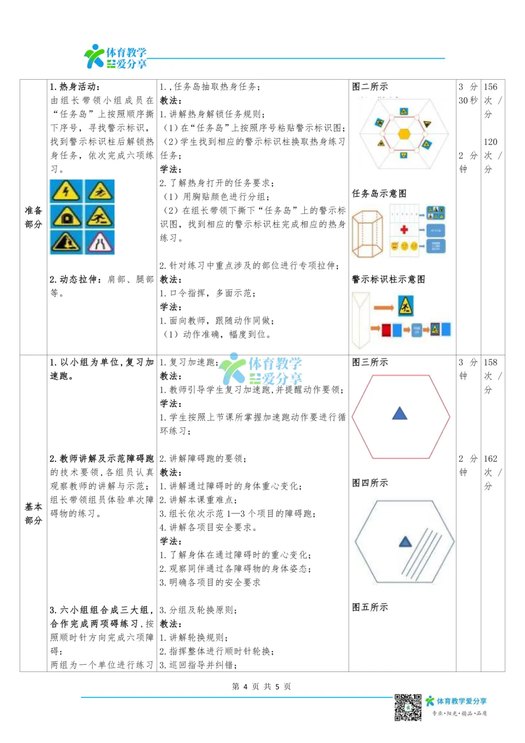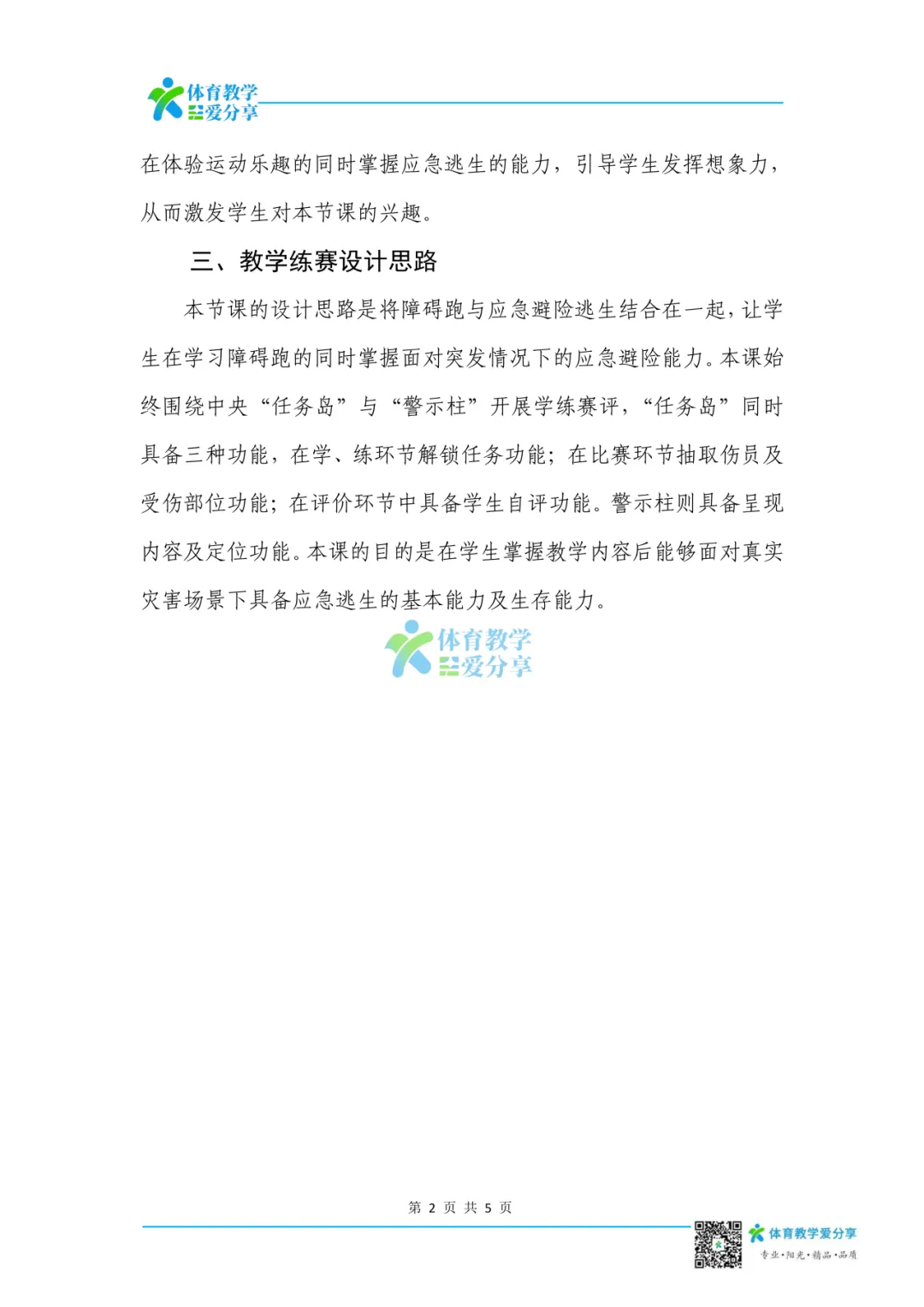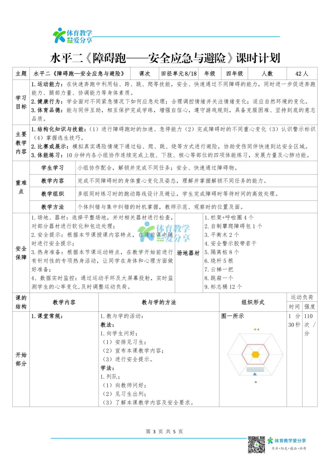 本课授课对象为四年级学生,该授课班级男生整体体能水平(身体耐力、力量、速度等)较高于女生,性格方面也较活泼开朗、好动,该班级女生整体较为文静、腼腆,这个年龄段的学生学生生理和心理都有明显变化,对事物充满好奇且善于模仿,喜欢有一定难度的,对于应急逃生知识的掌握也较薄弱。由于该班级男生表现欲望较强,活泼开朗的特性,能够在学练的过程中主动带动其他同学积极参与学练,并活跃课堂气氛,从“要我学”转变为“我要学”,激发学生在学练中表现出应有的主动性和积极性。因此,在教学中主动创设生动形象的情境,通过模拟突发灾害场景,设置日常生活中常见的障碍物及警示标识,结合障碍跑的练习方法,将安全知识与生活相融合,让学生在体验运动乐趣的同时掌握应急逃生的能力,引导学生发挥想象力,从而激发学生对本节课的兴趣。