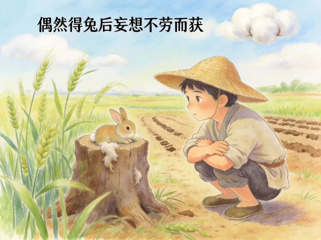 👨🏫 教师活动:1. 出示句子“兔走触株,折颈而死”,提问:“这里的‘走’是什么意思?和咱们现在说的‘走’有什么不一样?”结合注释讲解“走”是“跑”的意思;2. 出示句子“因释其耒而守株,冀复得兔”,讲解“释”是放下,“耒”是农具,“冀”是希望,提问:“农夫为什么放下农具不耕田了?他的想法对吗?”3. 引导学生思考:“兔子撞死是经常发生的事吗?农夫把偶然发生的事当成必然,会有什么后果?”同时结合思政教育:“咱们学习、做事可不能像农夫这样心存侥幸,要脚踏实地靠自己的努力”