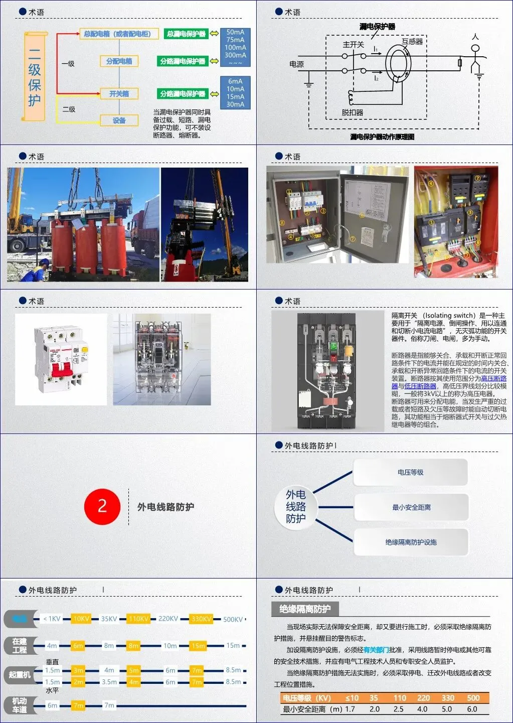针对外电线路防护,课件列出了不同电压等级(如1kV、10kV、35kV至500kV)下在建工程与外电线路之间的最小安全距离(垂直与水平方向),并指出当无法满足安全距离时,必须采取绝缘隔离防护措施、设置警告标志,甚至申请停电或迁改线路。