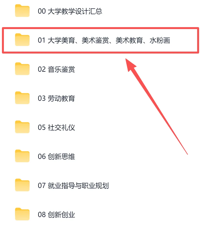 在编号01开头的“大学美育、美术鉴赏、美术教育、水粉画” 的文件夹里,大家对着文件夹名称查找即可,有预览图的