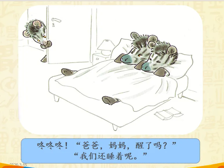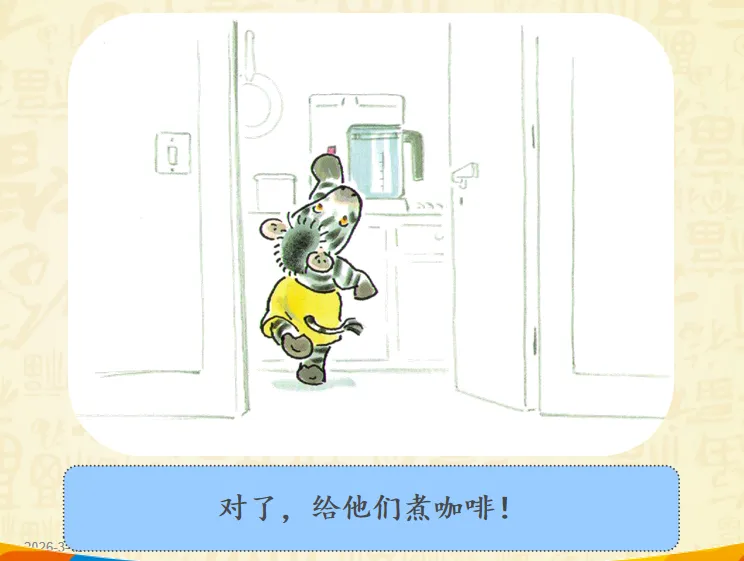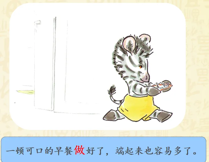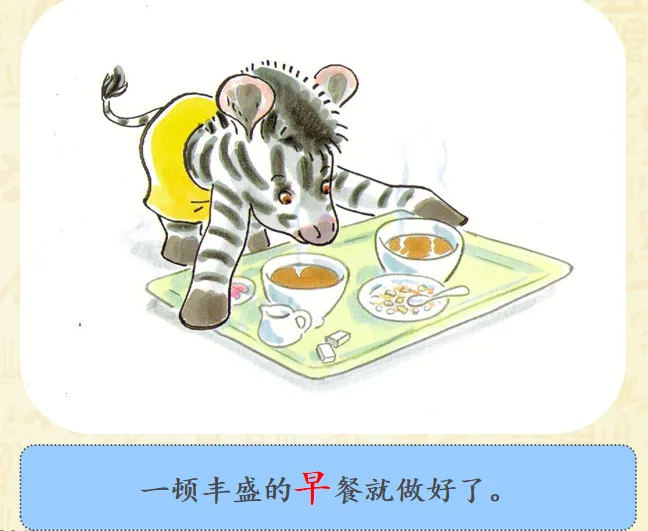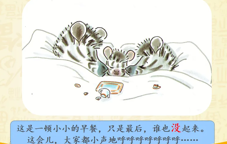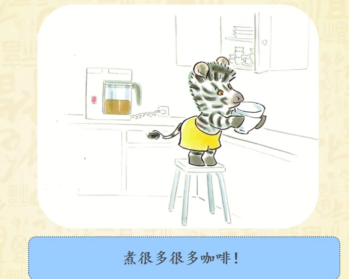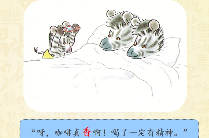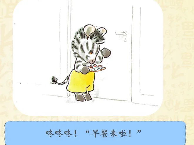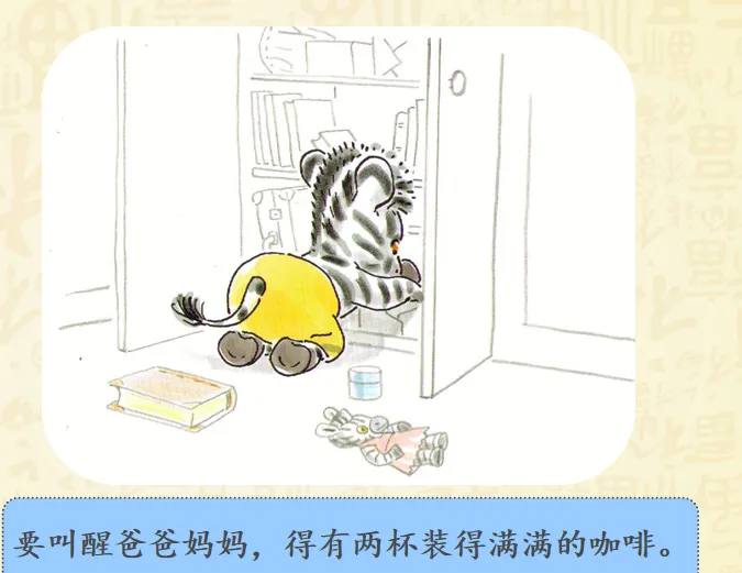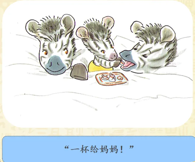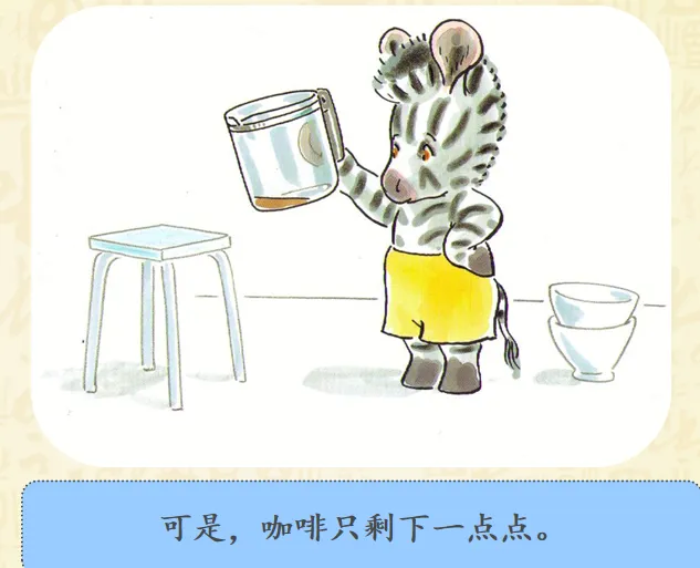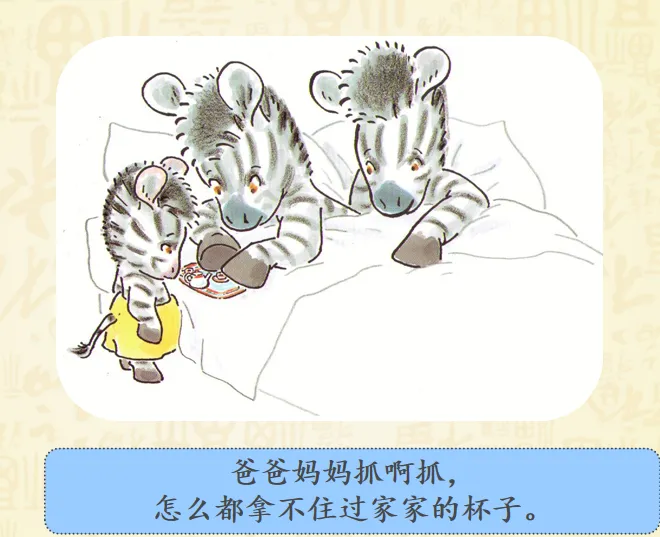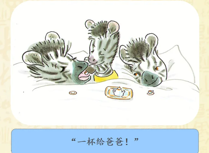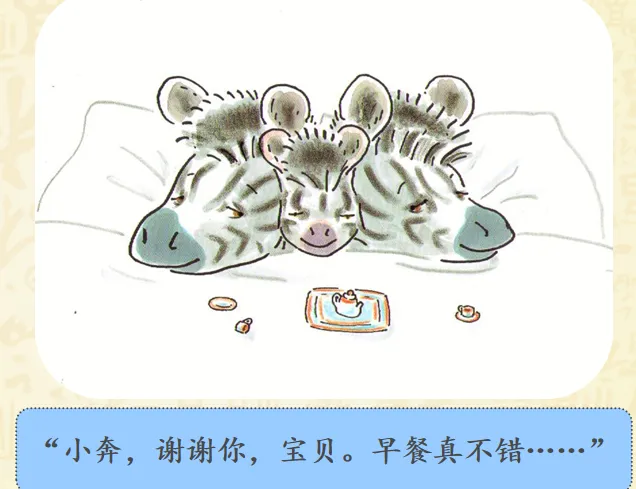 早上,小奔睡醒了,而爸爸妈妈还睡着。小斑马想爬到他们的床上去。聪明的小斑马想到了一个好办法——为他们做一顿幸福而丰盛的早餐。故事讲述的是斑马小奔早早起床了,但是爸爸妈妈还睡着,怎样让他们早早起床呢?小奔决定为爸爸妈妈做顿早餐!哇!丰盛的早餐做好了,小奔小心翼翼地要端给爸爸妈妈的时候,一不小心摔倒了,早餐都洒了!可是,咖啡只剩下一点,不够装满大杯子了,小奔想了个办法,装到了过家家的迷你的小杯里。看到这里,真的要为小奔的聪明感到高兴呢,可是杯子太小啦!爸爸妈妈拿不住,小奔自己拿起来喂爸爸妈妈,然后,他们起床了吗?不!一家三口呼呼呼呼地又睡着啦!哈哈哈哈哈哈