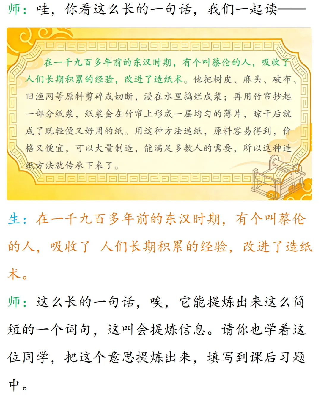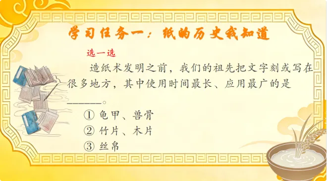 师:选哪一个?生:我选3,书上说了“竹片和木片,是造纸术发明之前中国使用时间最长、应用最广、影响最大的书写材料”。